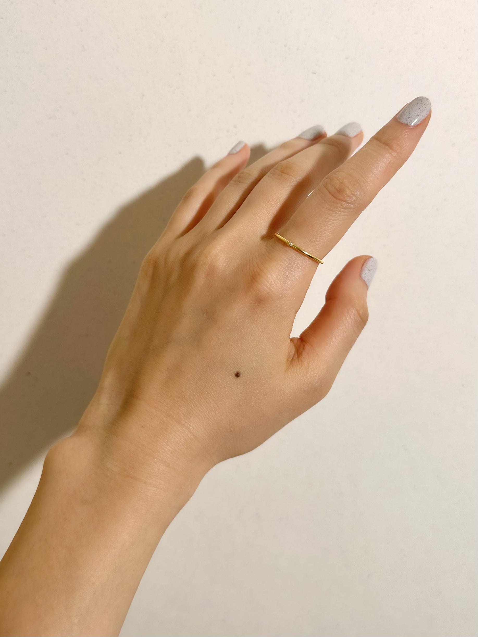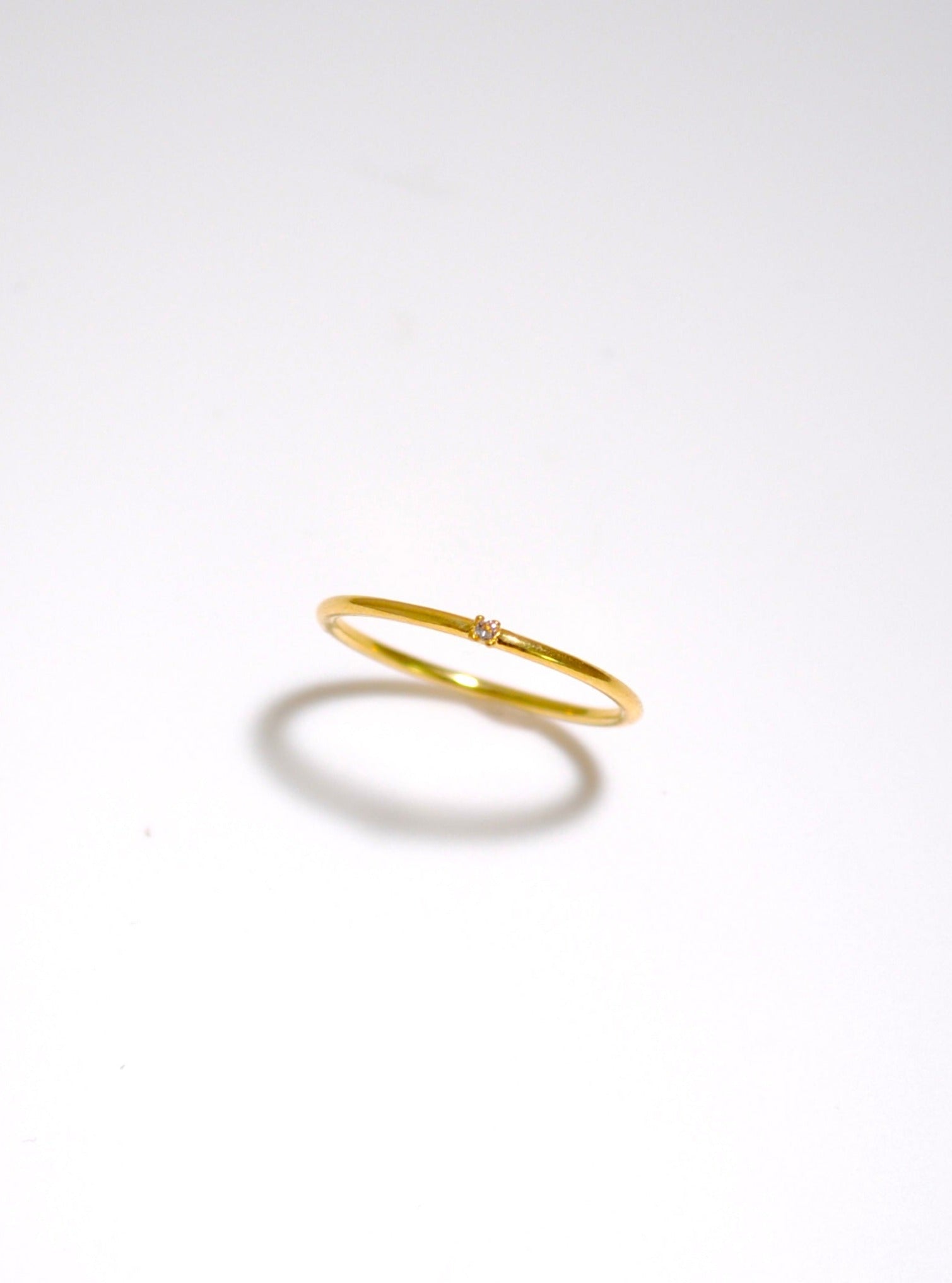 ベーシックでシンプルな一粒のホワイトダイヤモンドが煌めくリング。どんなシーンにも使い勝手のよいあなたの万能ジュエリーになるはずです。限りなくシンプルでベーシックな地金リング。 おしゃれ度を底上げしてくれるレイヤードには欠かせないアイテムです。繊細なシルエットで、女性らしさを引き立たせてくれます。
