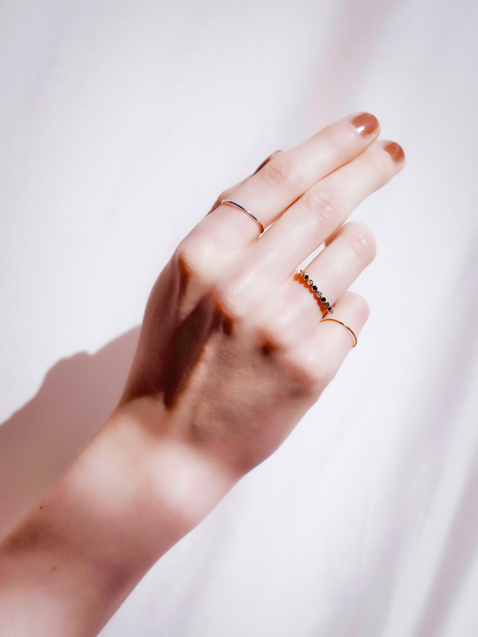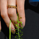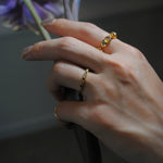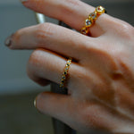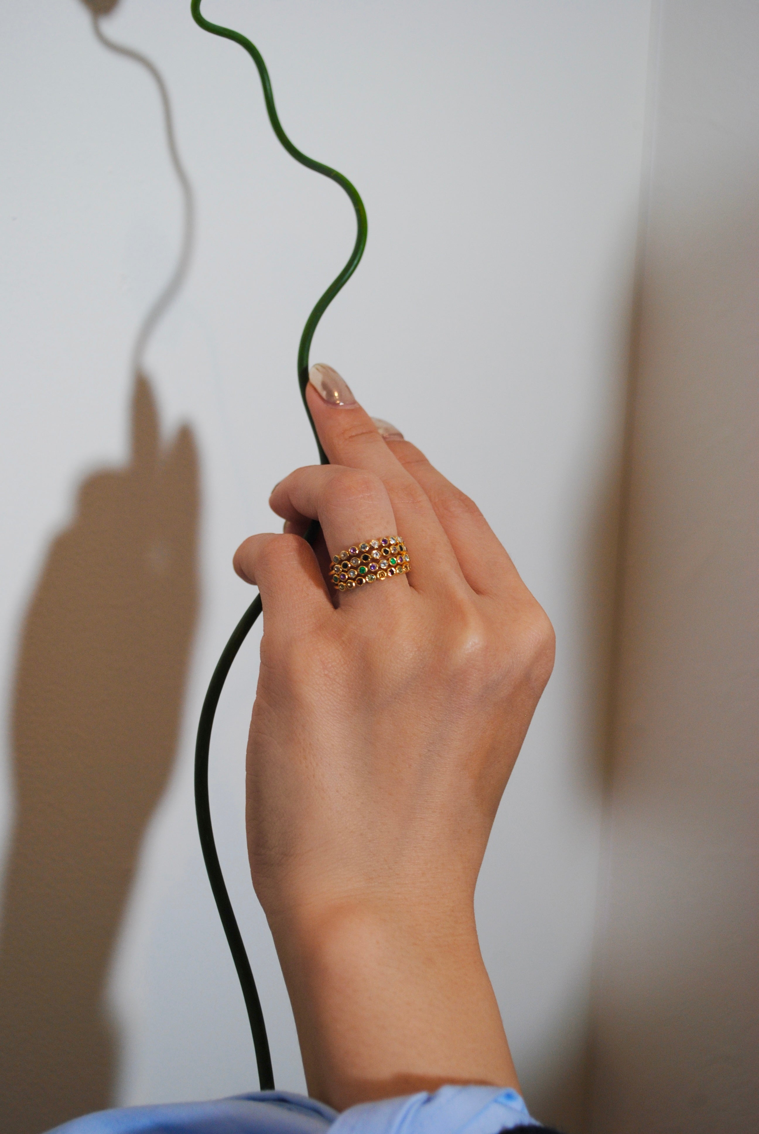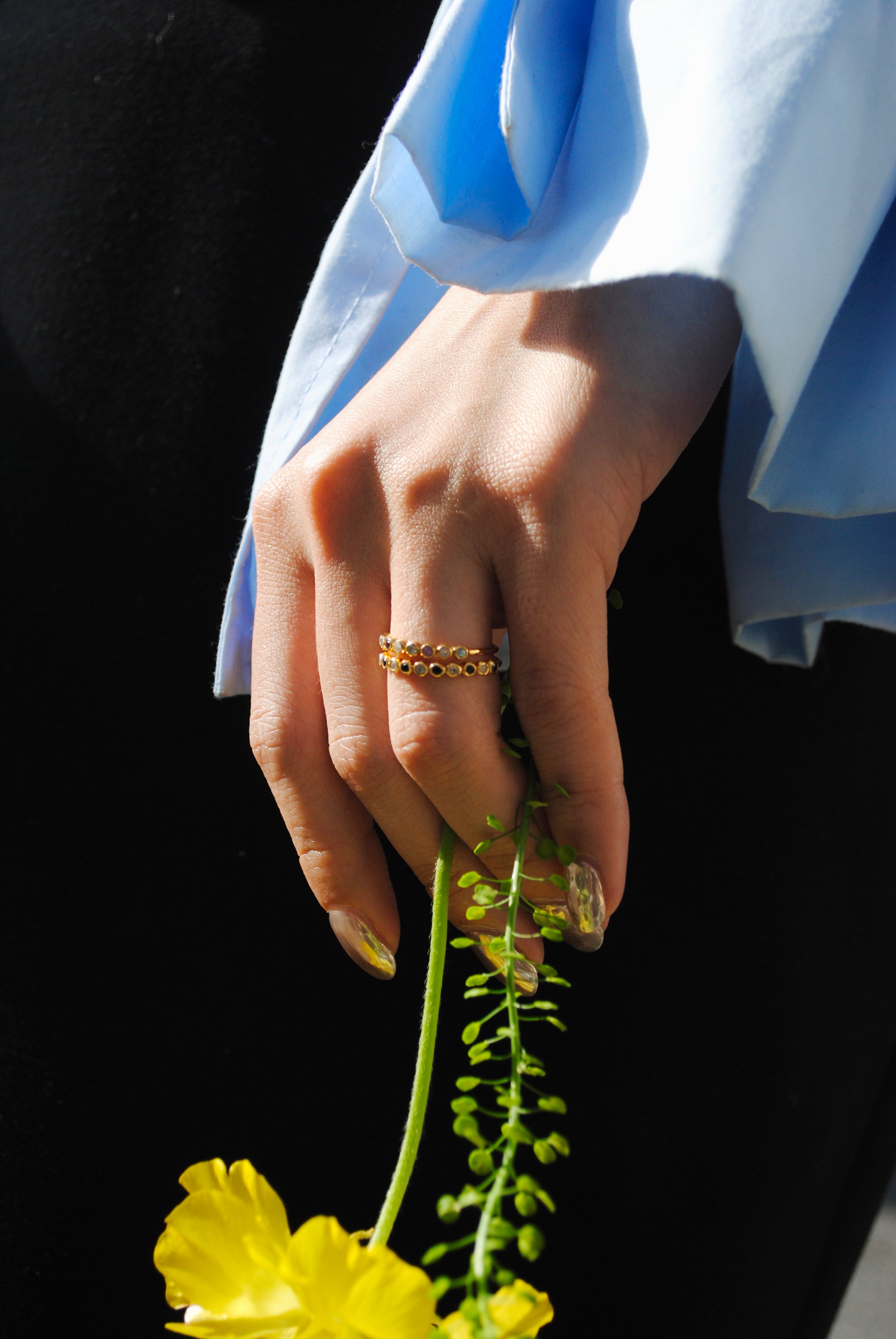 小さなラウンドカットの粒を半周半周ぐるりと連ねたハーフエタニティリング。マルチなストーンの色合わせが華やかな印象ながら、小粒なゆえ合わせやすさもばっちり。同商品を複数スタッキングするのもよし、他の天然石のリングに合わせるもよし。普段のリングがより華やかな雰囲気になるはず。