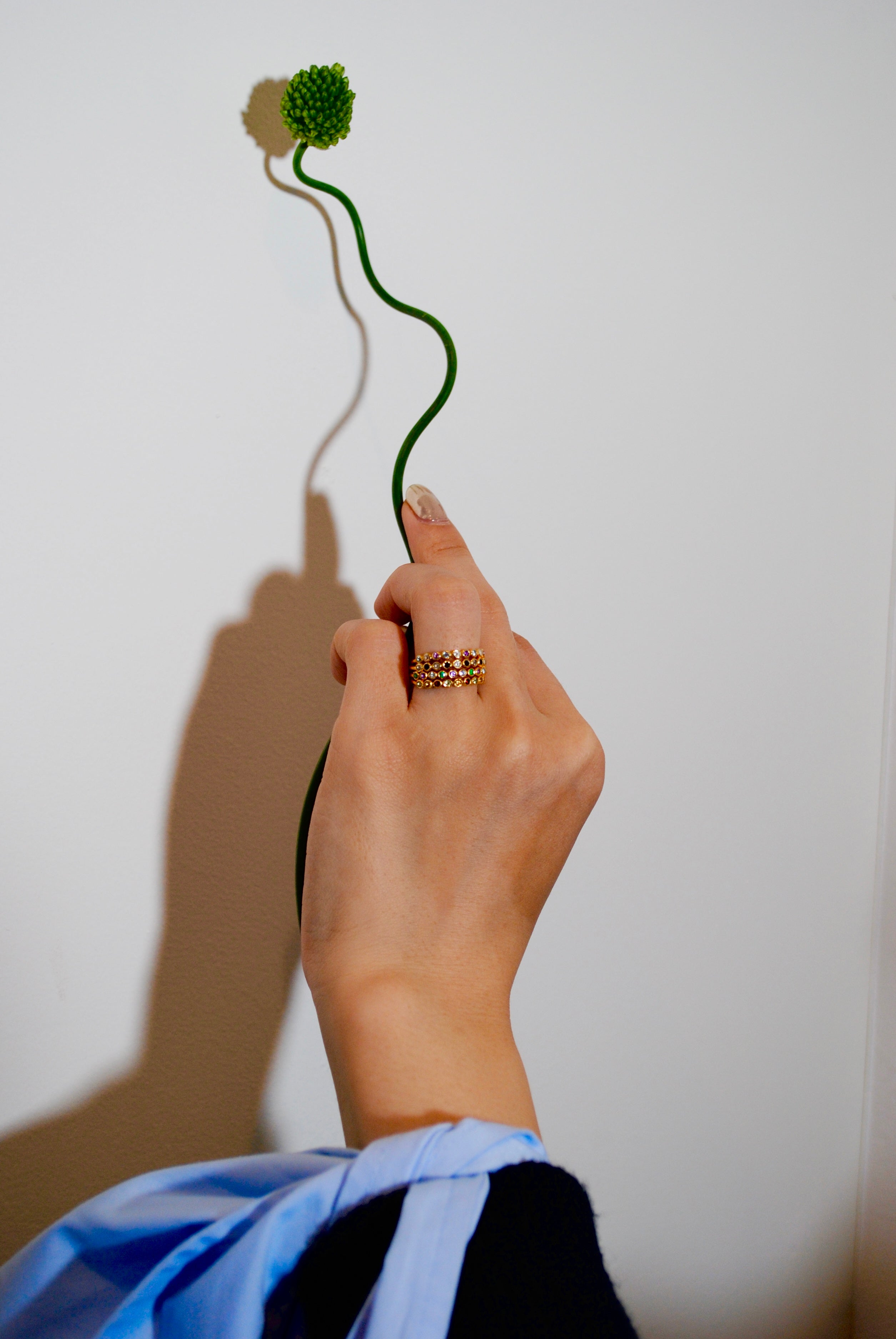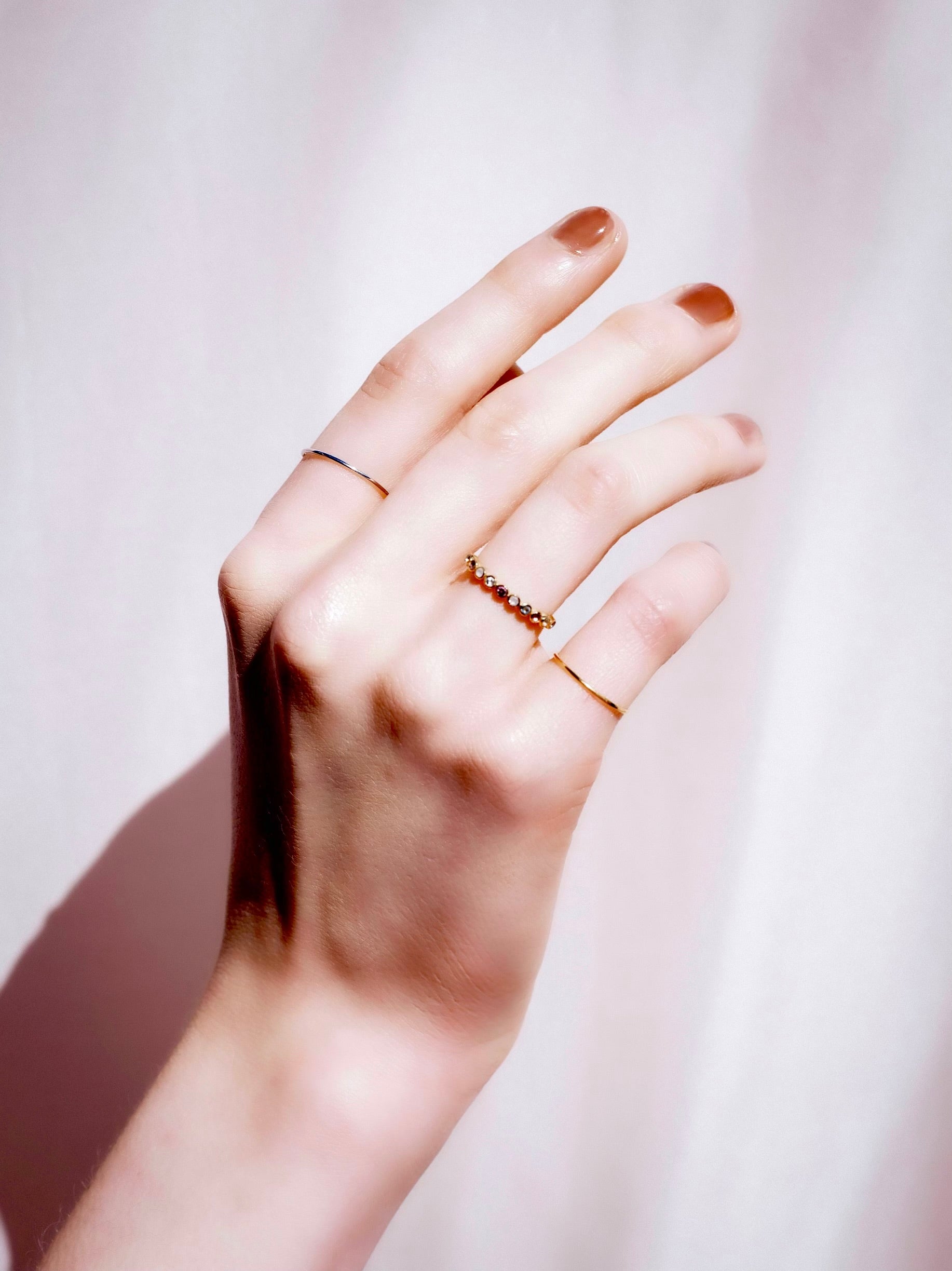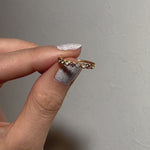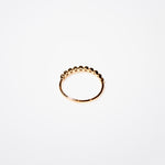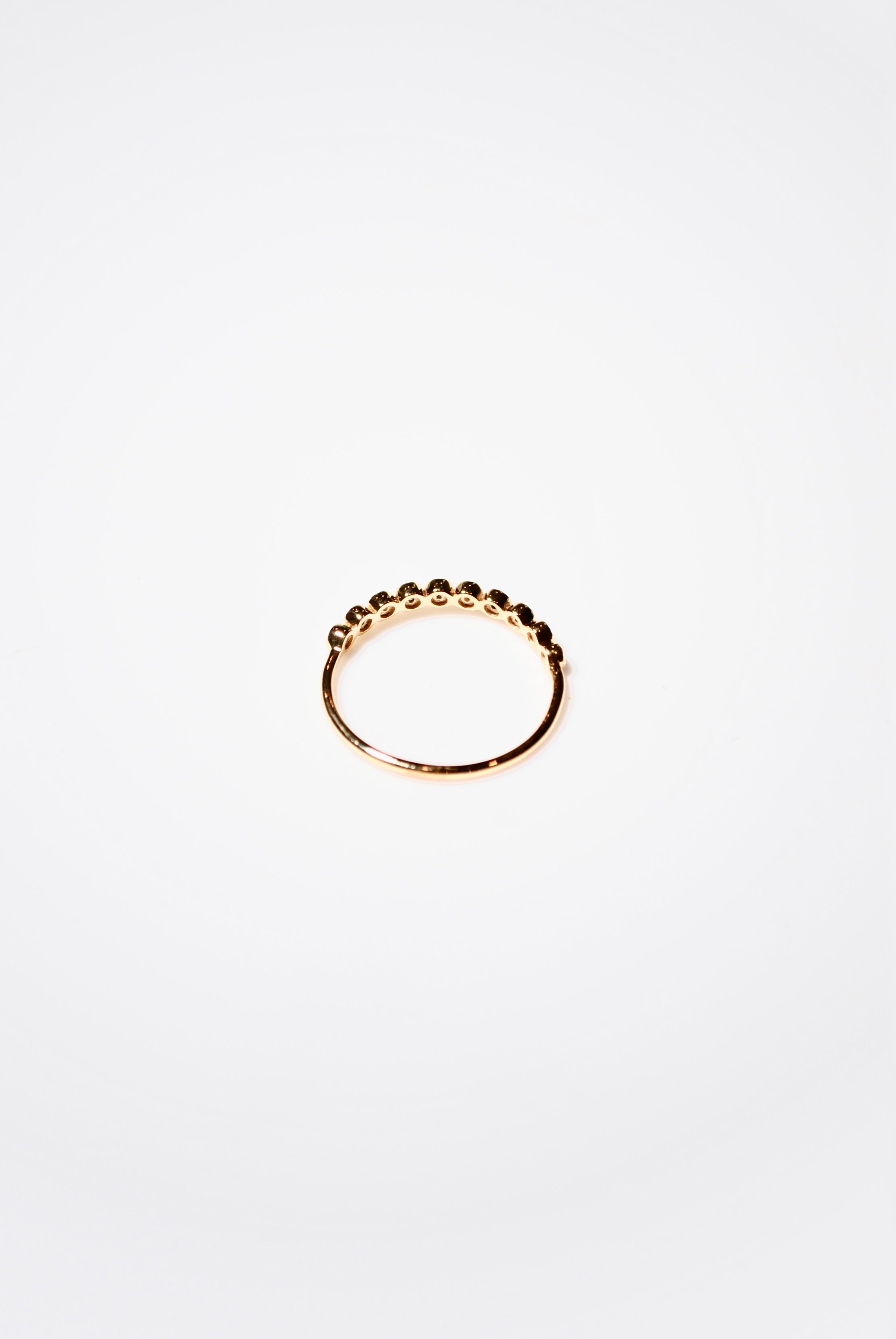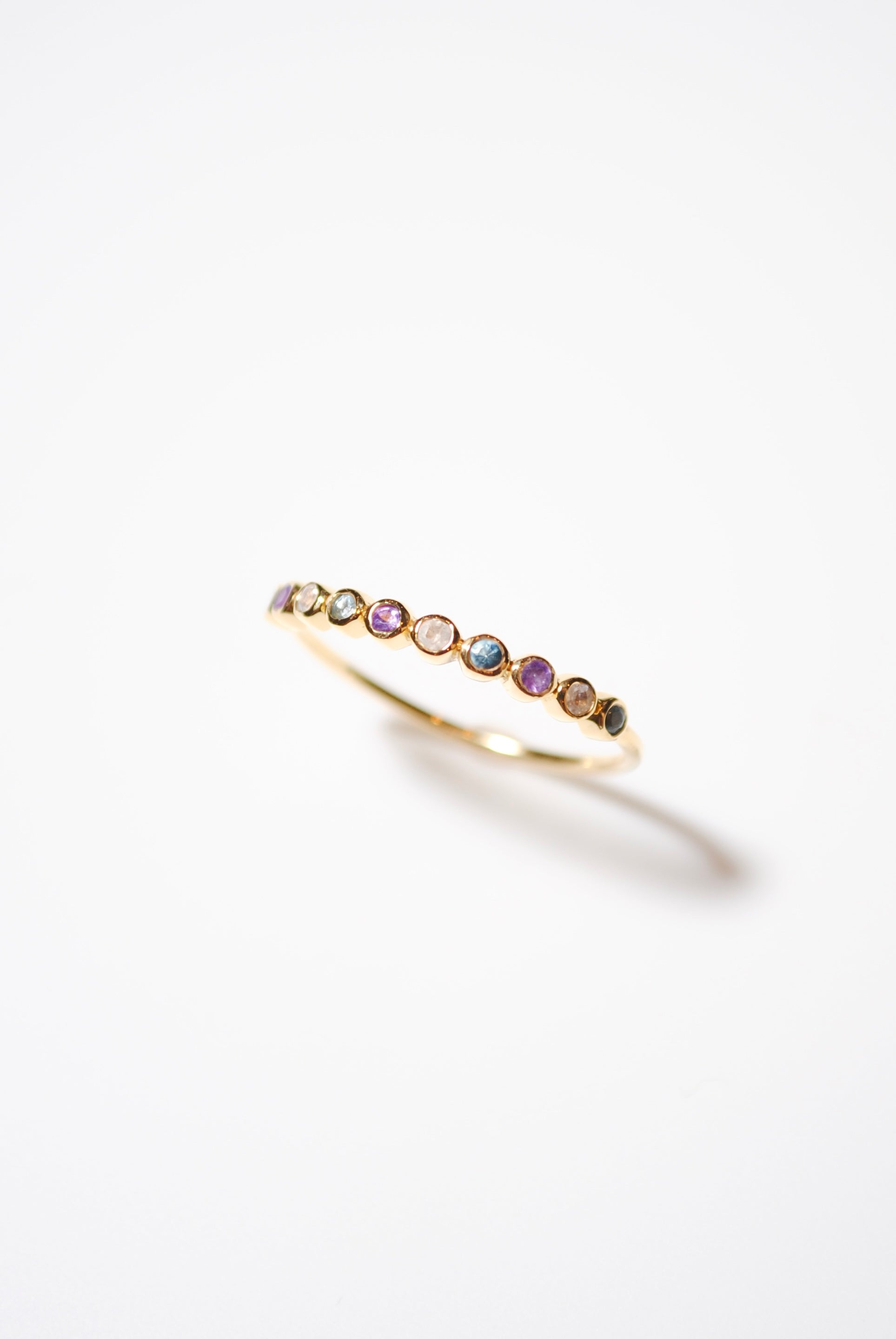 小さなラウンドカットの粒を半周半周ぐるりと連ねたハーフエタニティリング。マルチなストーンの色合わせが華やかな印象ながら、小粒なゆえ合わせやすさもばっちり。同商品を複数スタッキングするのもよし、他の天然石のリングに合わせるもよし。普段のリングがより華やかな雰囲気になるはず。