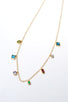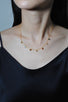 細いゴールドチェーンに、ラグジュアリーな色も形も違う石をバランスよく散りばめたネックレス。動くたびに石がきらめき、華やかな印象を与えます。ひとつで主役にも、重ね付けでアクセントにもなるデザイン。