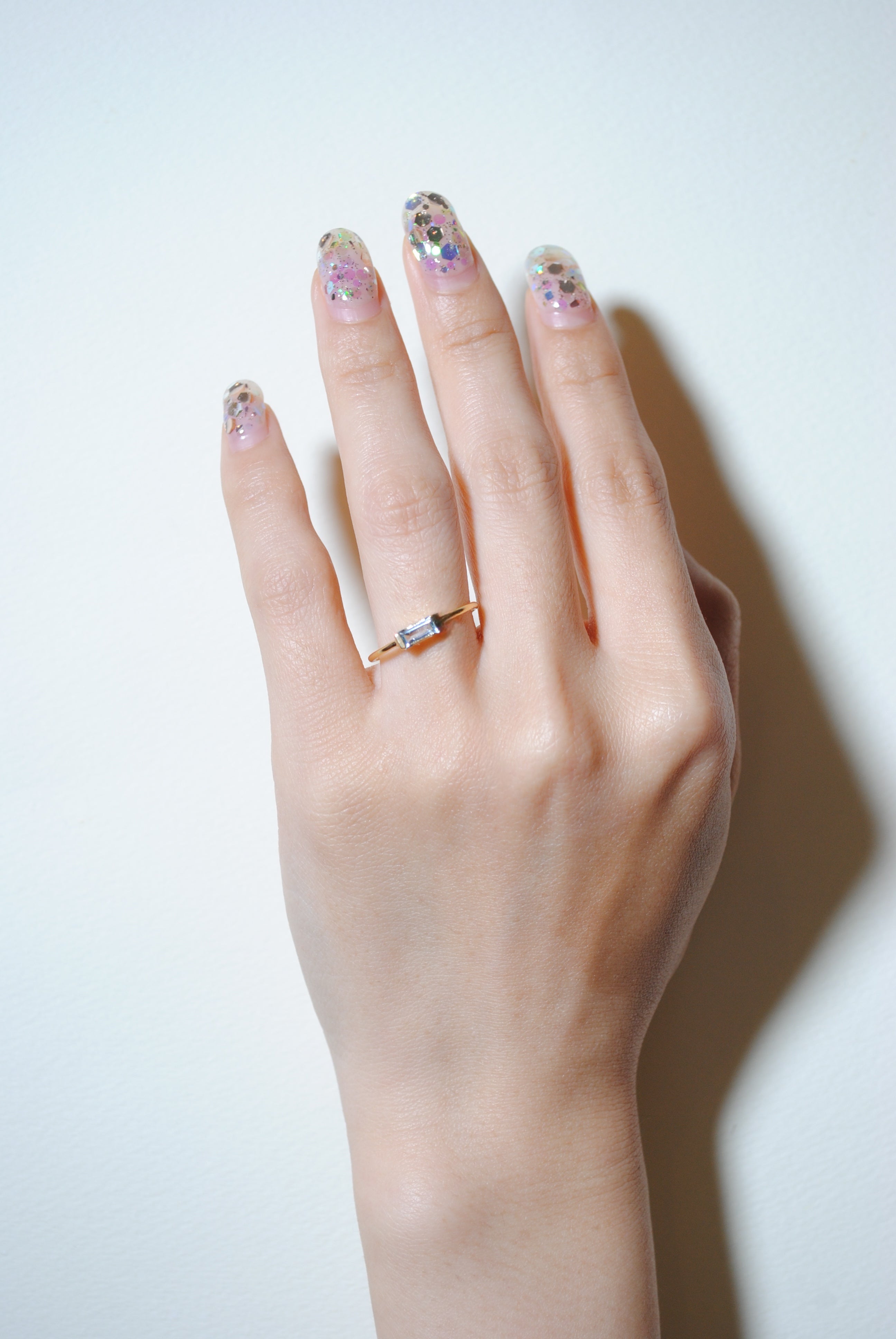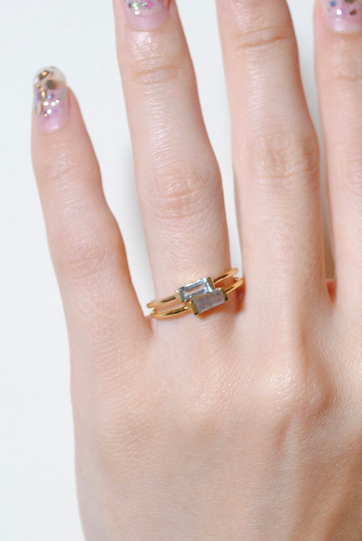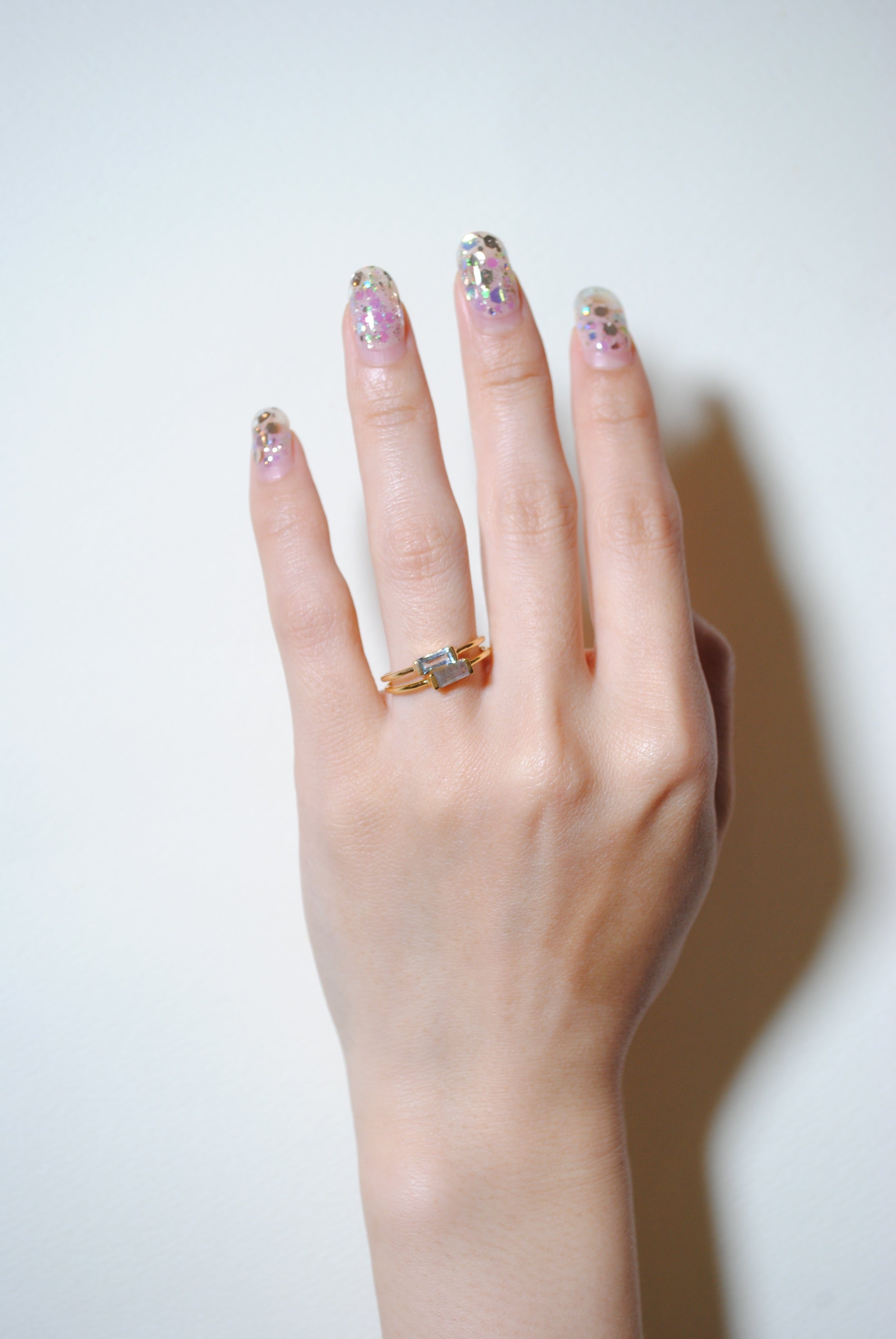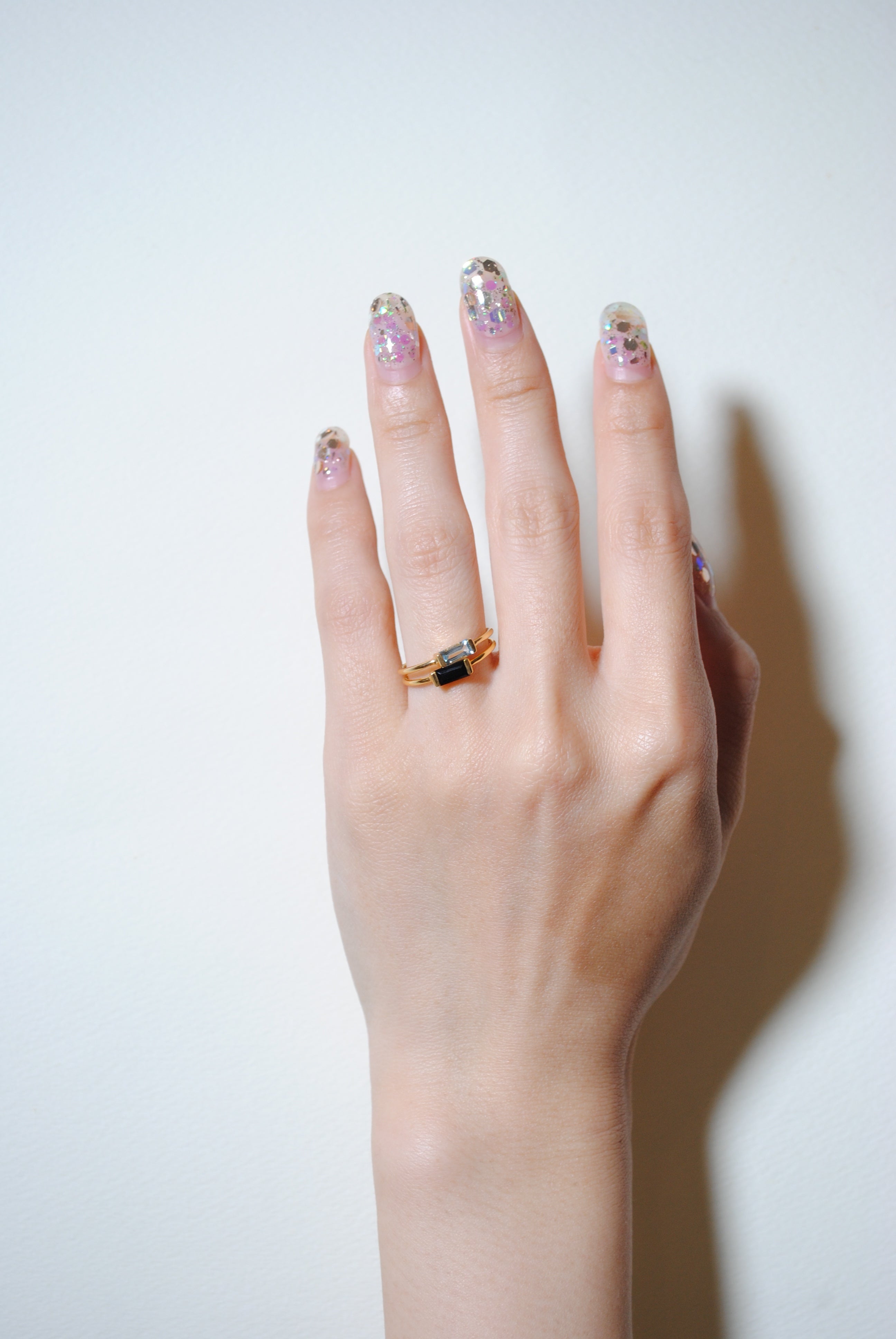 両サイドのみで挟み込むように石を固定したセッティングをしているため、石の美しさがより際立つジュエリーに仕上げました。カラーバリエーションが豊富で、小ぶりなサイズなのでお好きなカラーを2つ重ね付けしても素敵です。