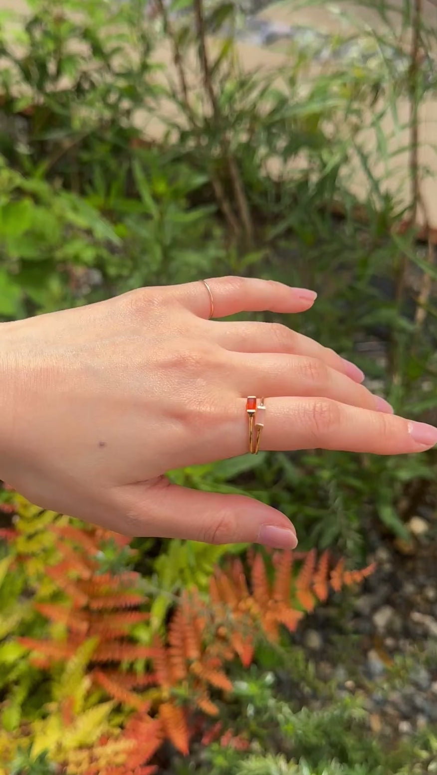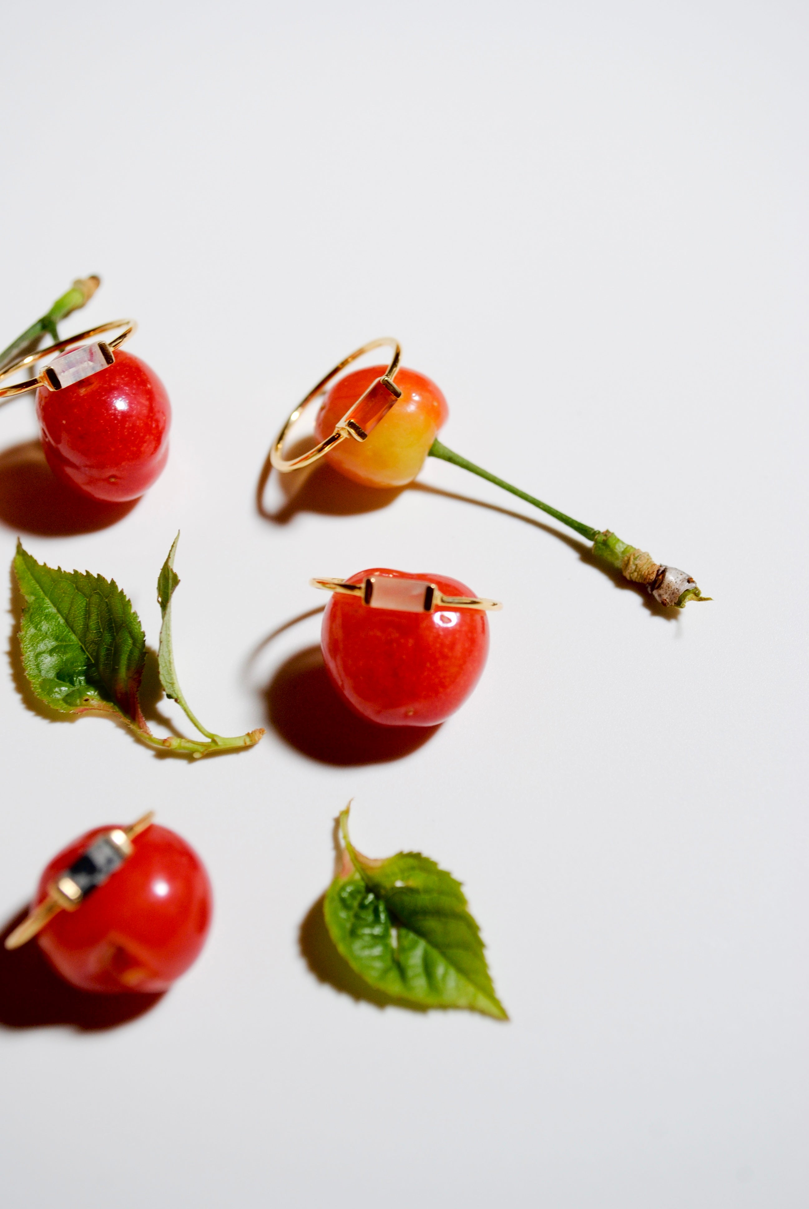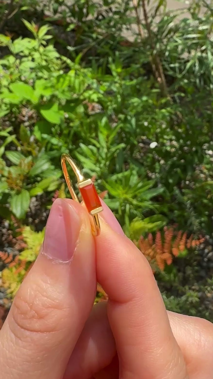 両サイドのみで挟み込むように石を固定したセッティングをしているため、石の美しさがより際立つジュエリーに仕上げました。カラーバリエーションが豊富で、小ぶりなサイズなのでお好きなカラーを2つ重ね付けしても素敵です。
