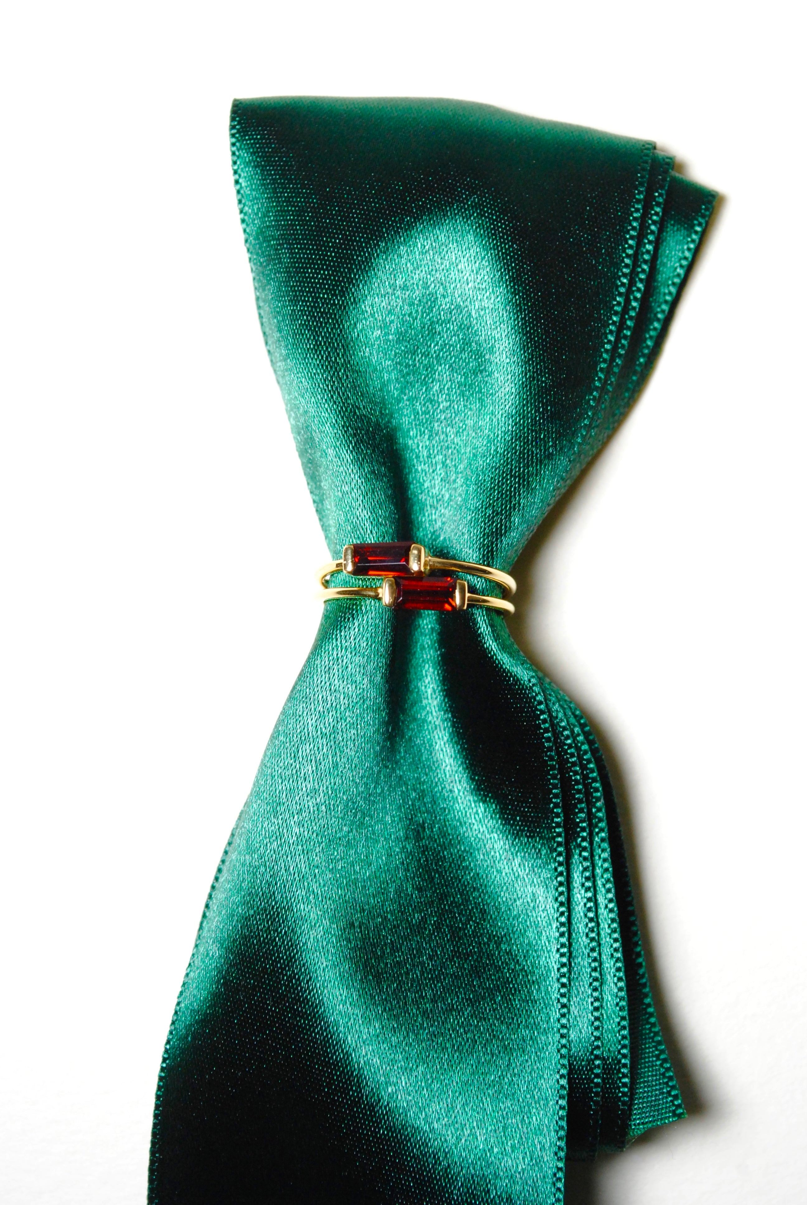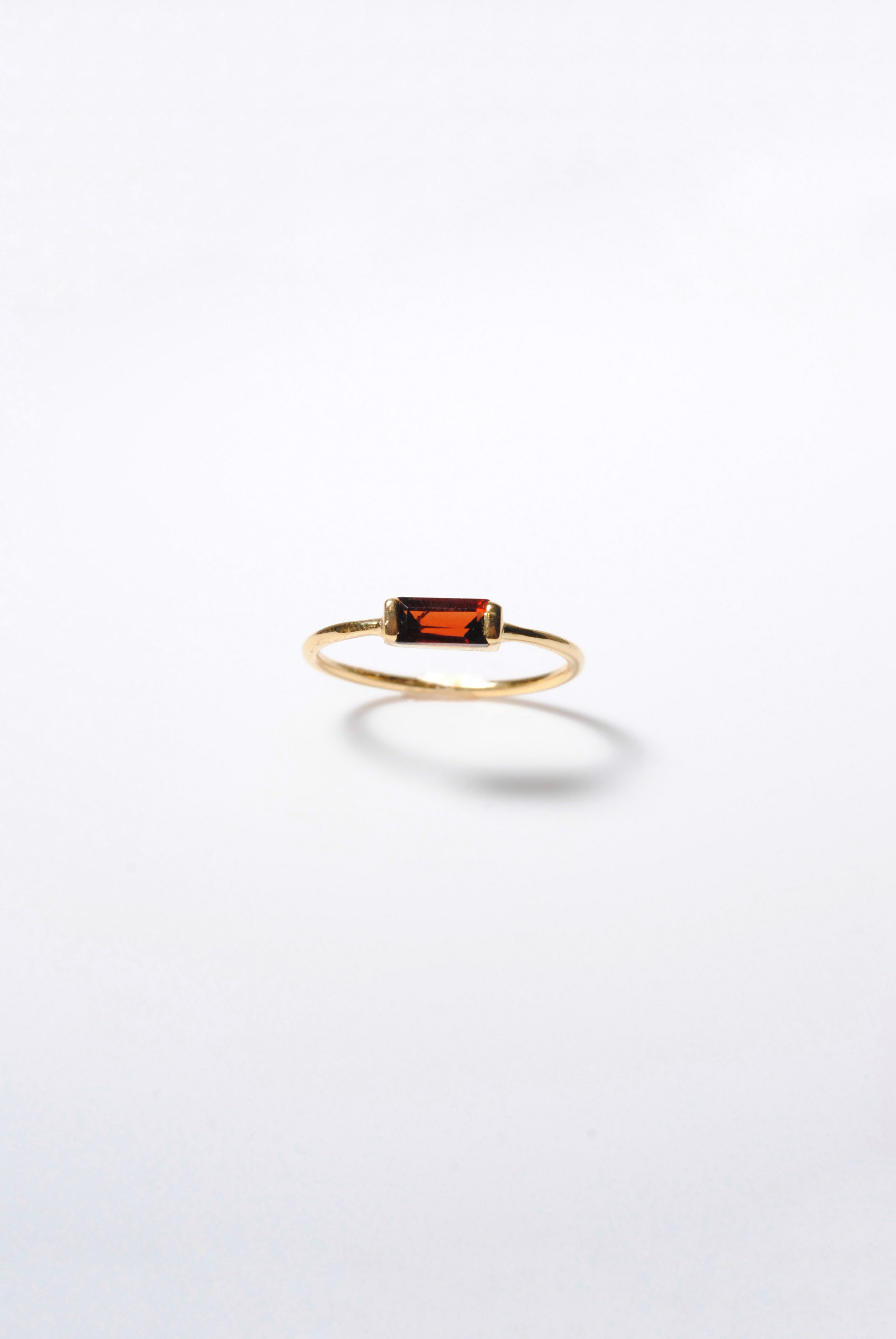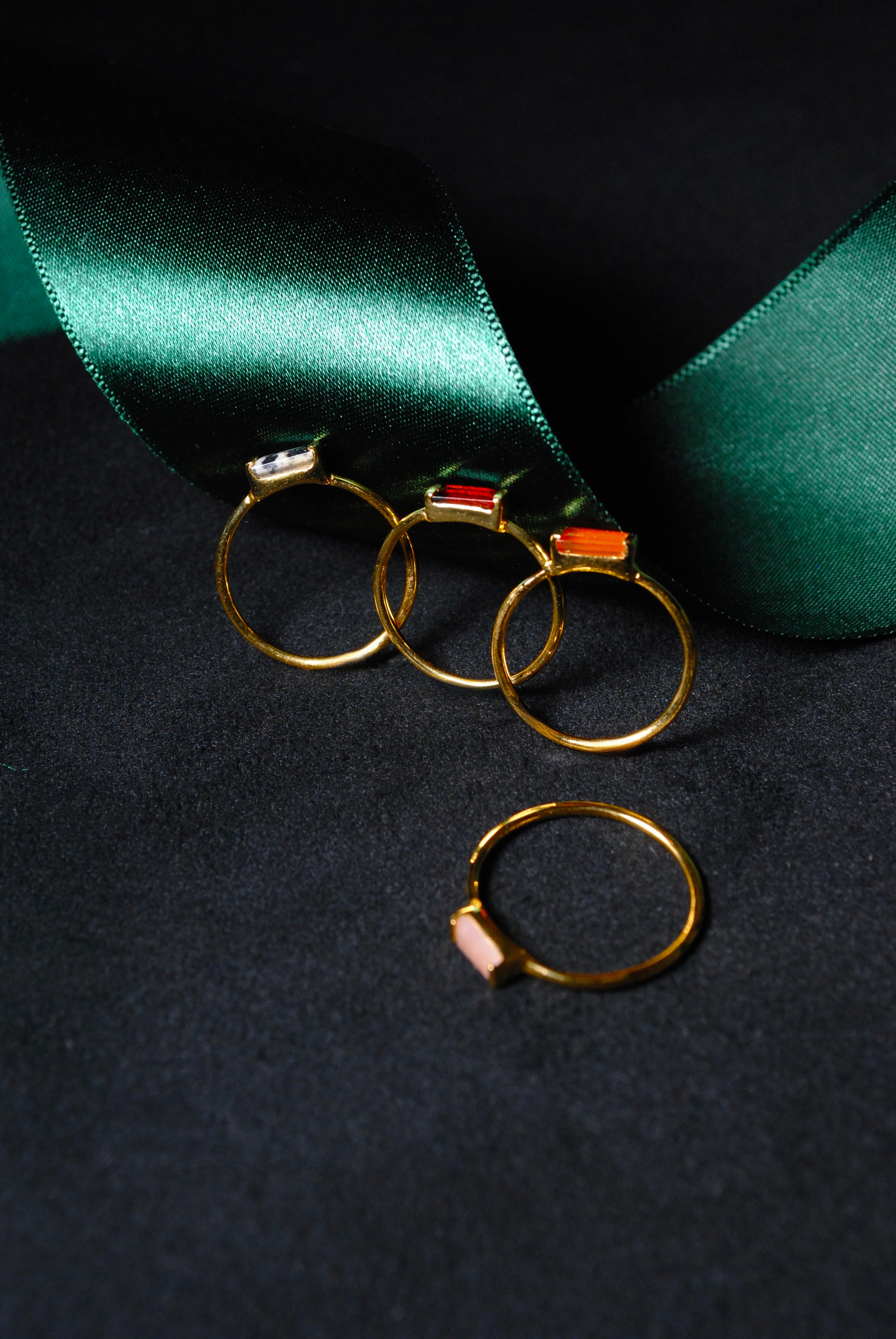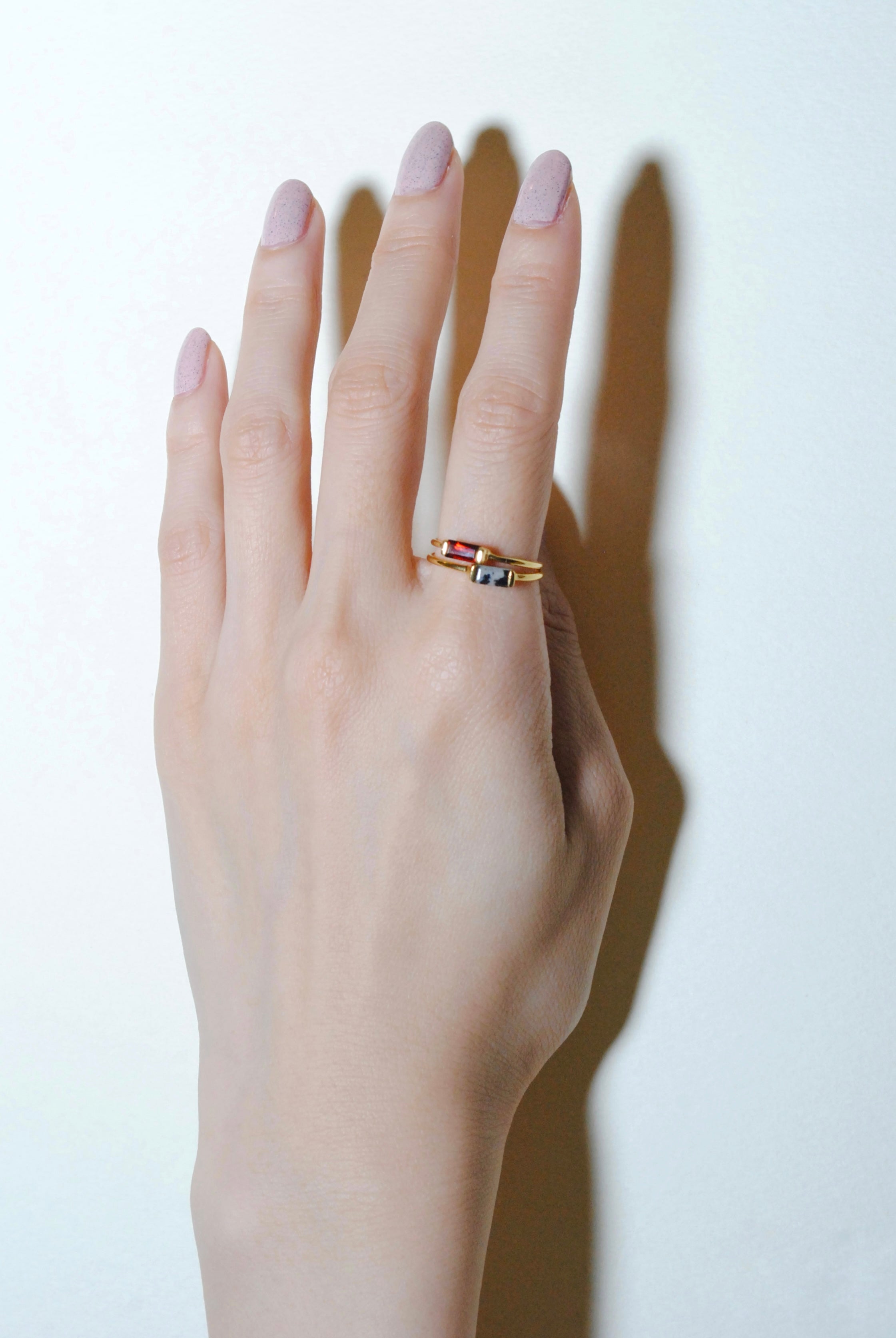 両サイドのみで挟み込むように石を固定したセッティングをしているため、石の美しさがより際立つジュエリーに仕上げました。カラーバリエーションが豊富で、小ぶりなサイズなのでお好きなカラーを2つ重ね付けしても素敵です。