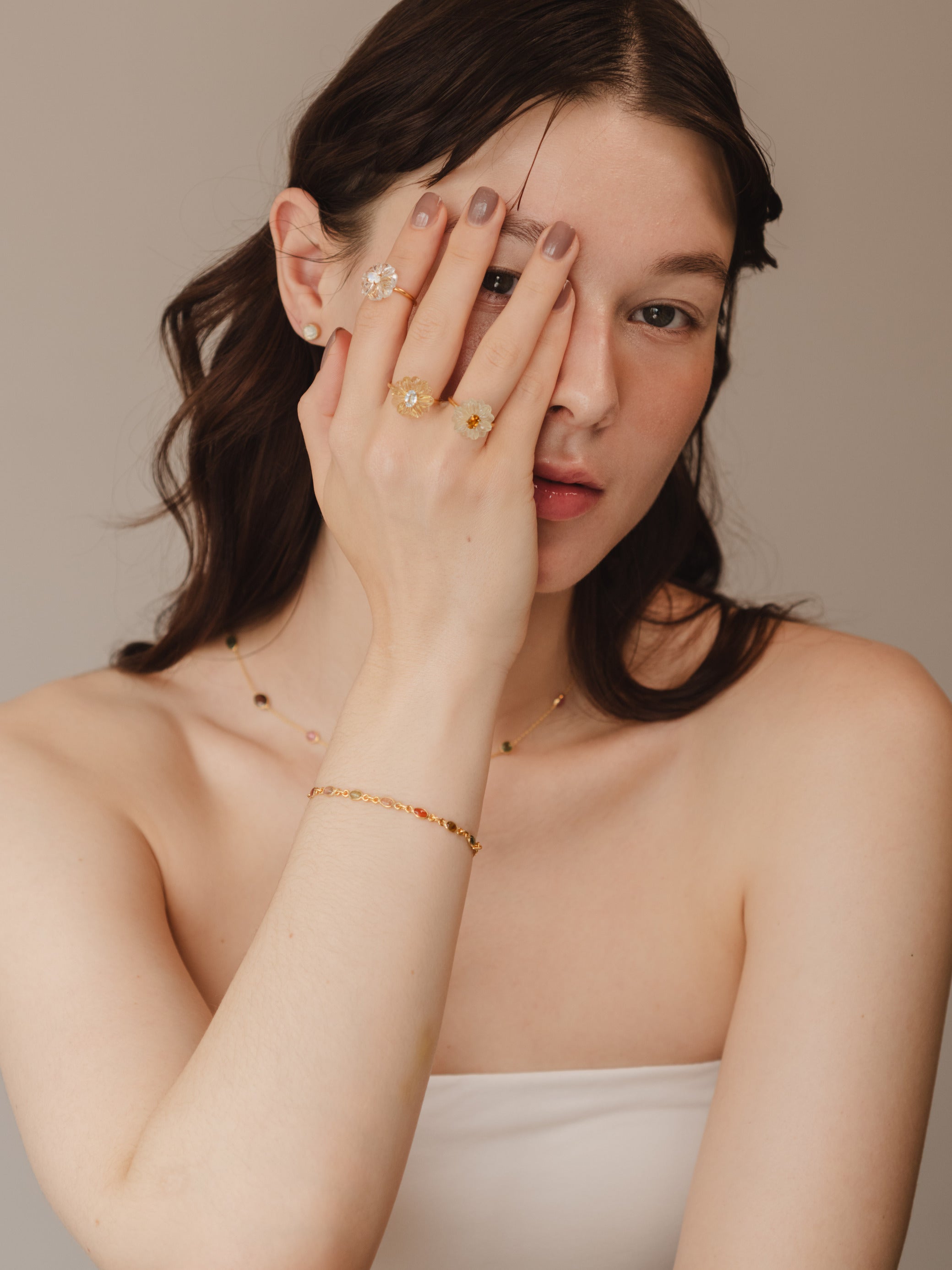 ストーンで花びらをカービング(彫刻)した華やかなジュエリー。めしべに当たる部分のストーンとの色遊びが楽しいリングです。