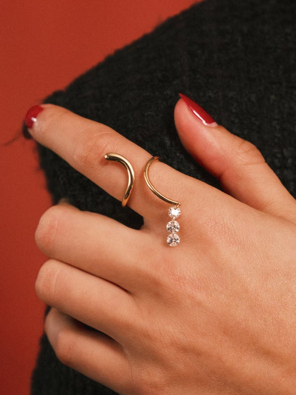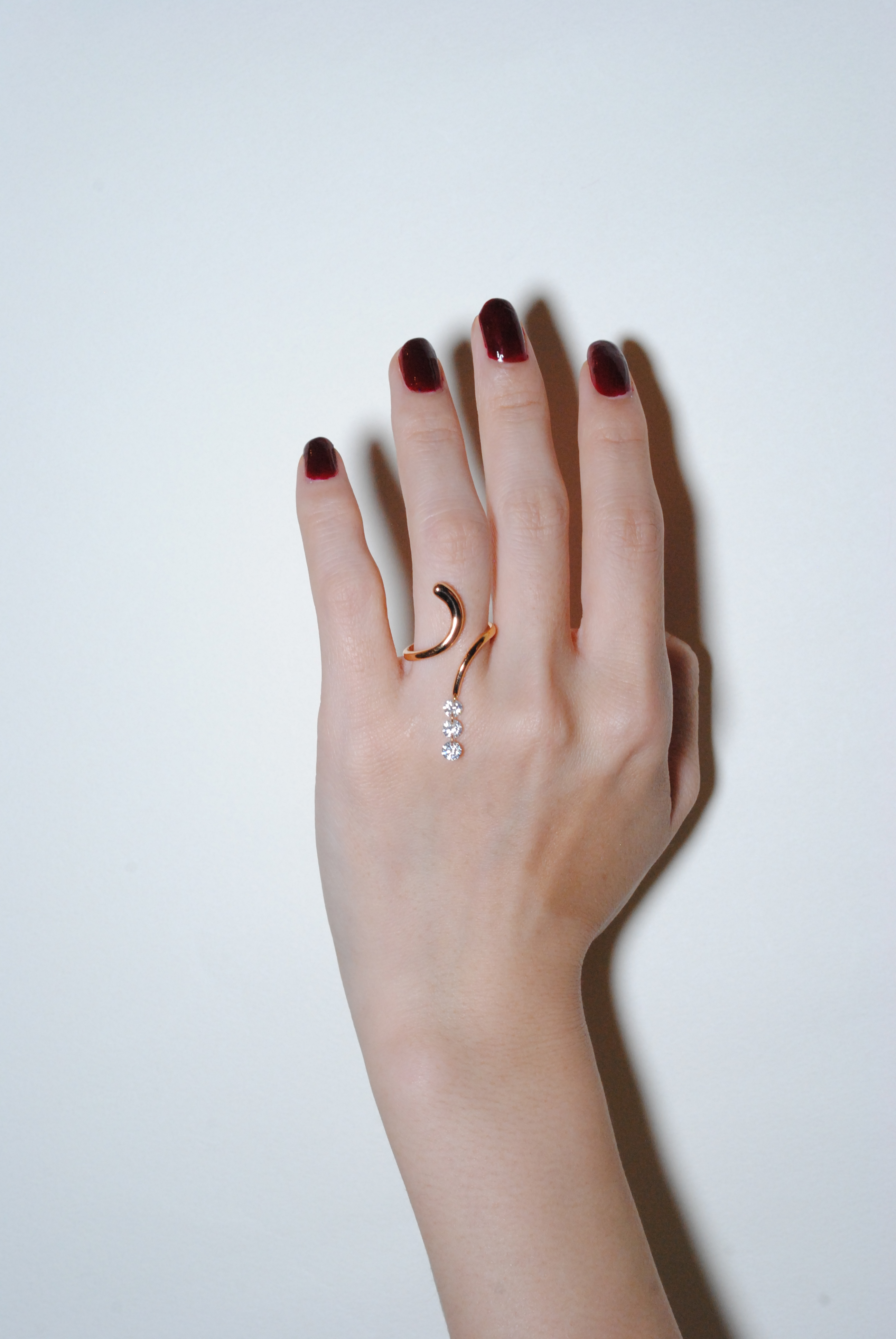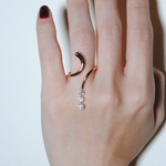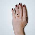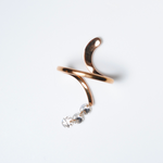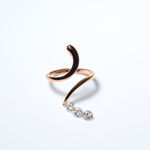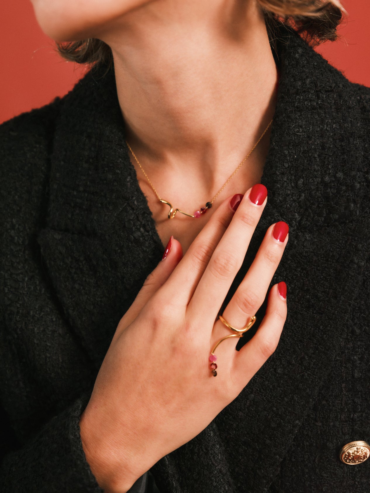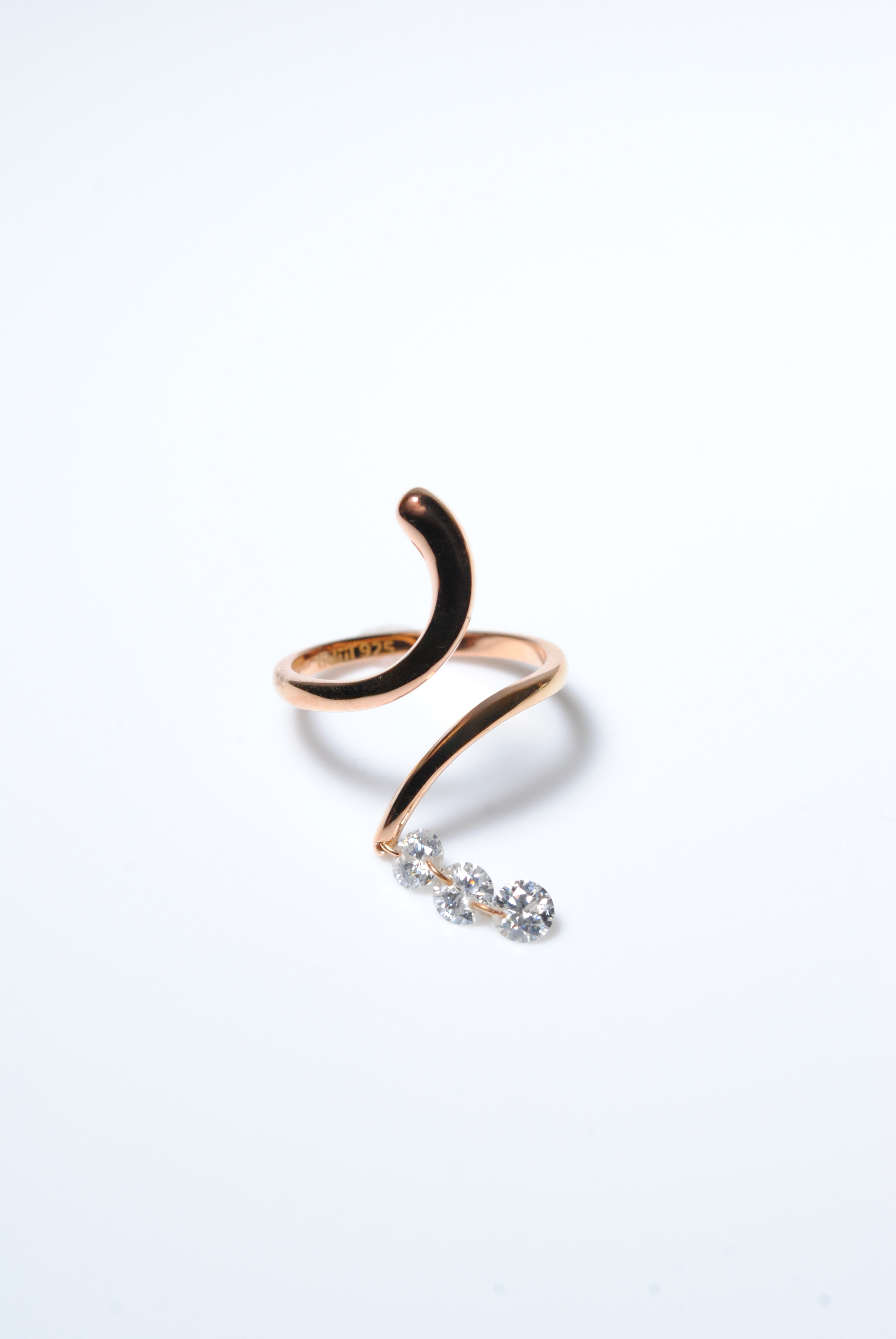 指にくるりと巻き付くラインの先に、小さな“しっぽ”のように揺れるカラーストーンが輝くリング。愛らしいシルエットの中に洗練された遊び心を宿し、見るたびに心を弾ませてくれるデザイン。