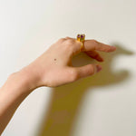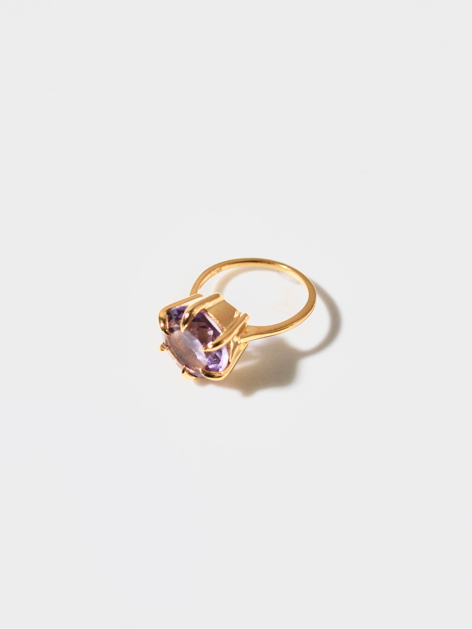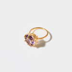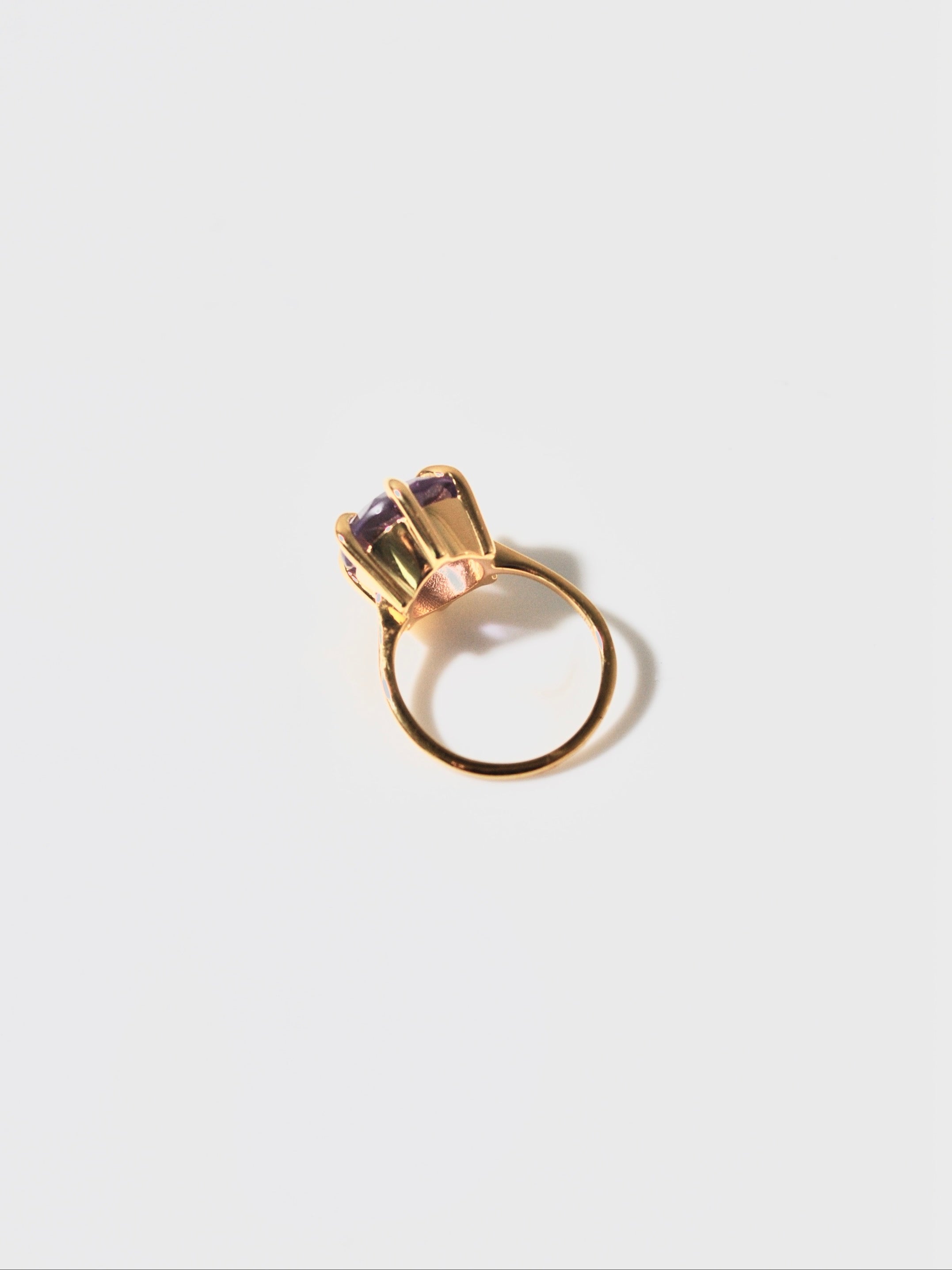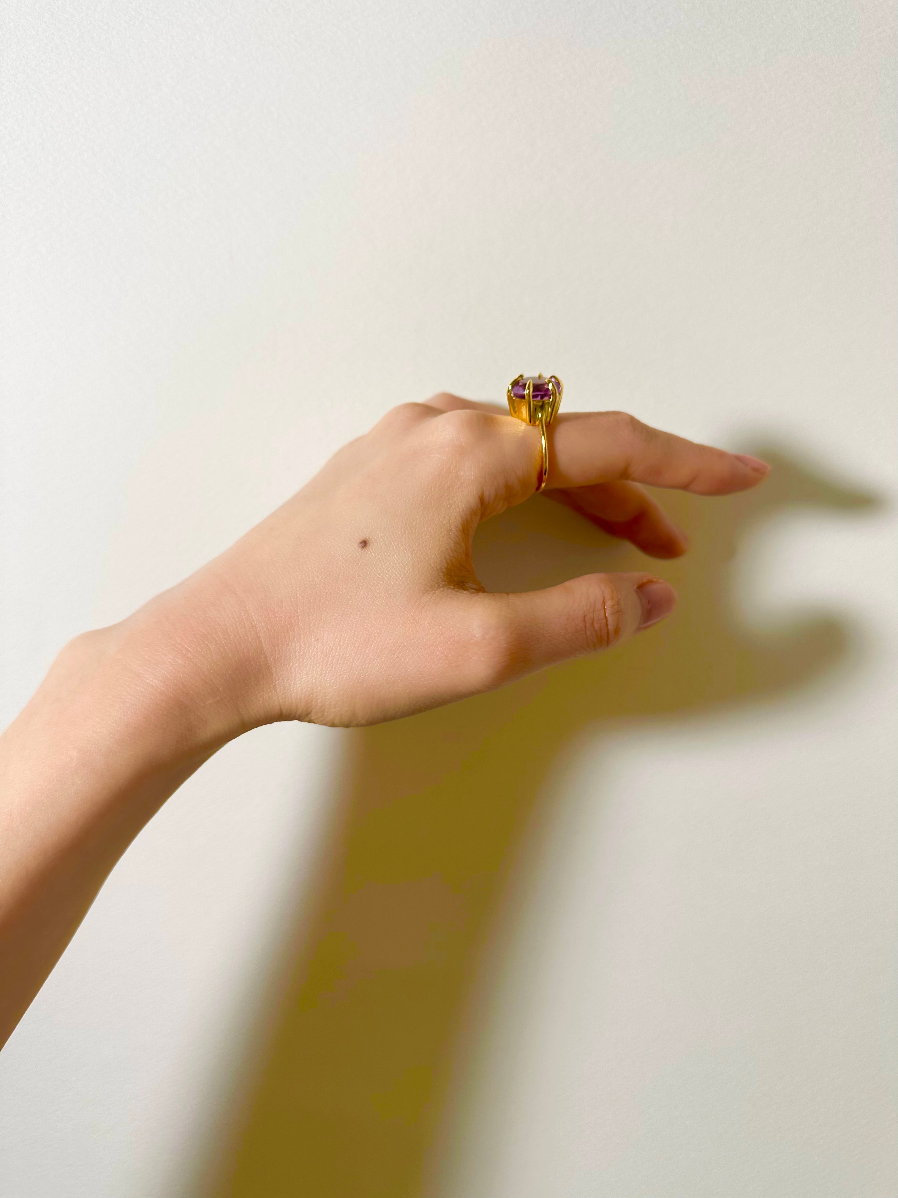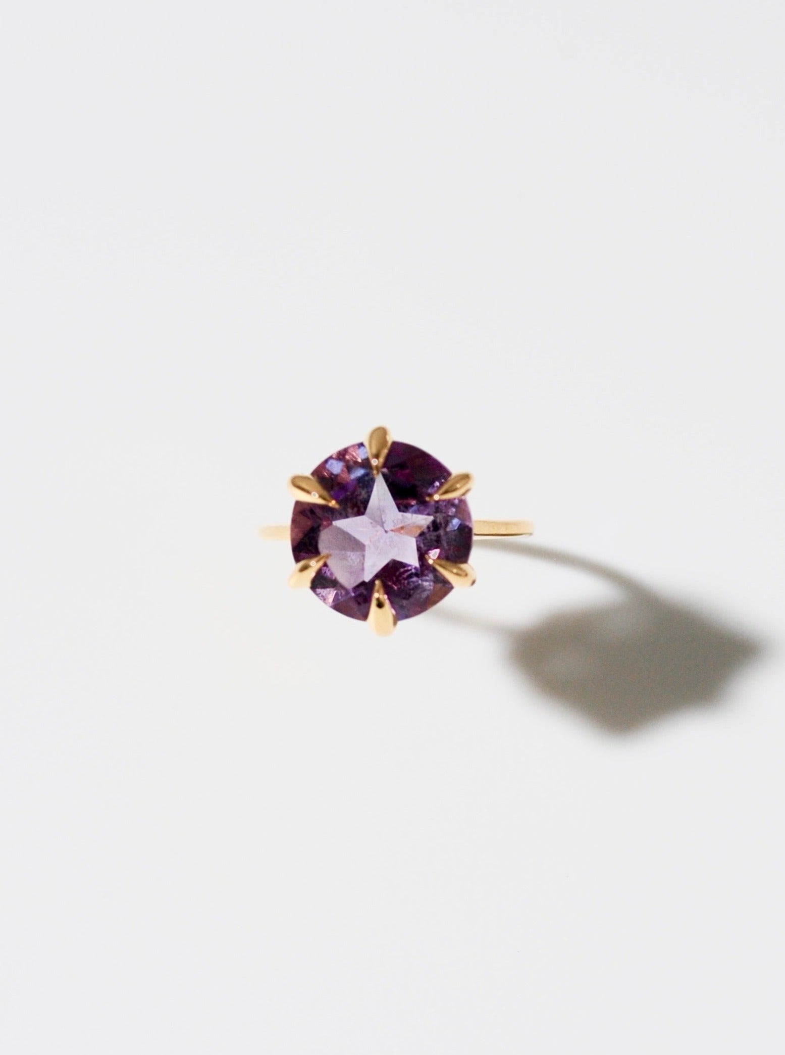 鋭い牙のような爪留めの中に、星が見えるカッティングを施したストーンを納めたリングは、食中有植物をイメージしてデザインしたのだとか。刺々しさの中にも、可愛さを含んだ絶妙なバランス感が秘訣のリング。