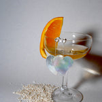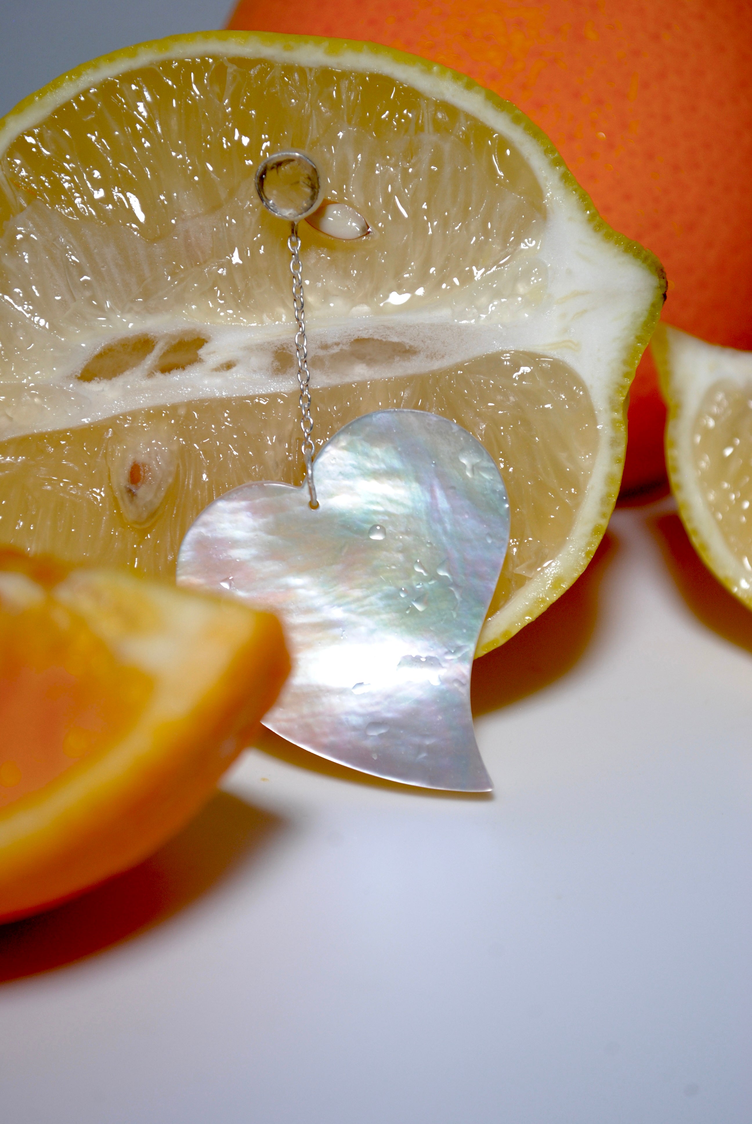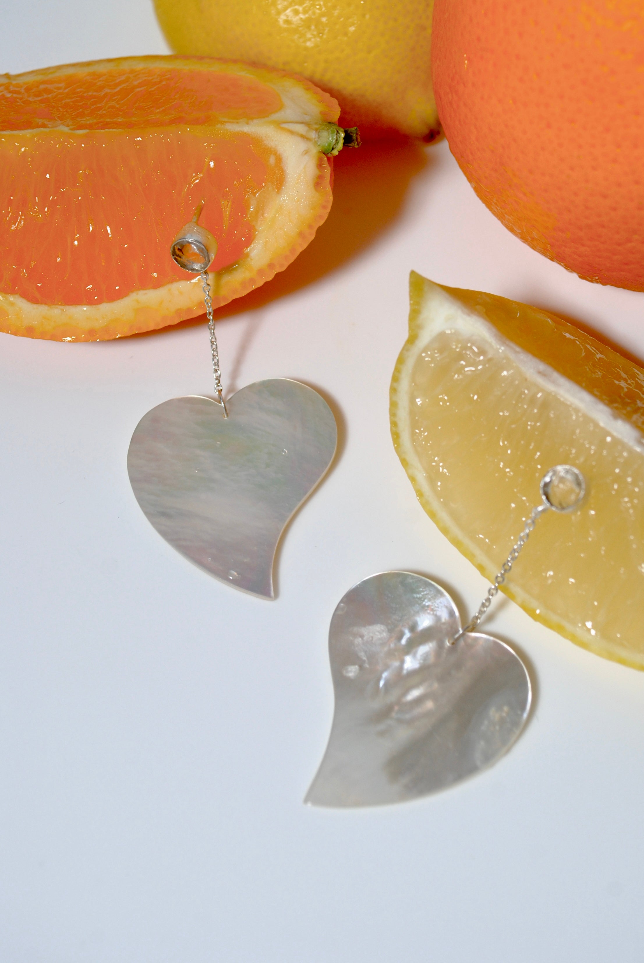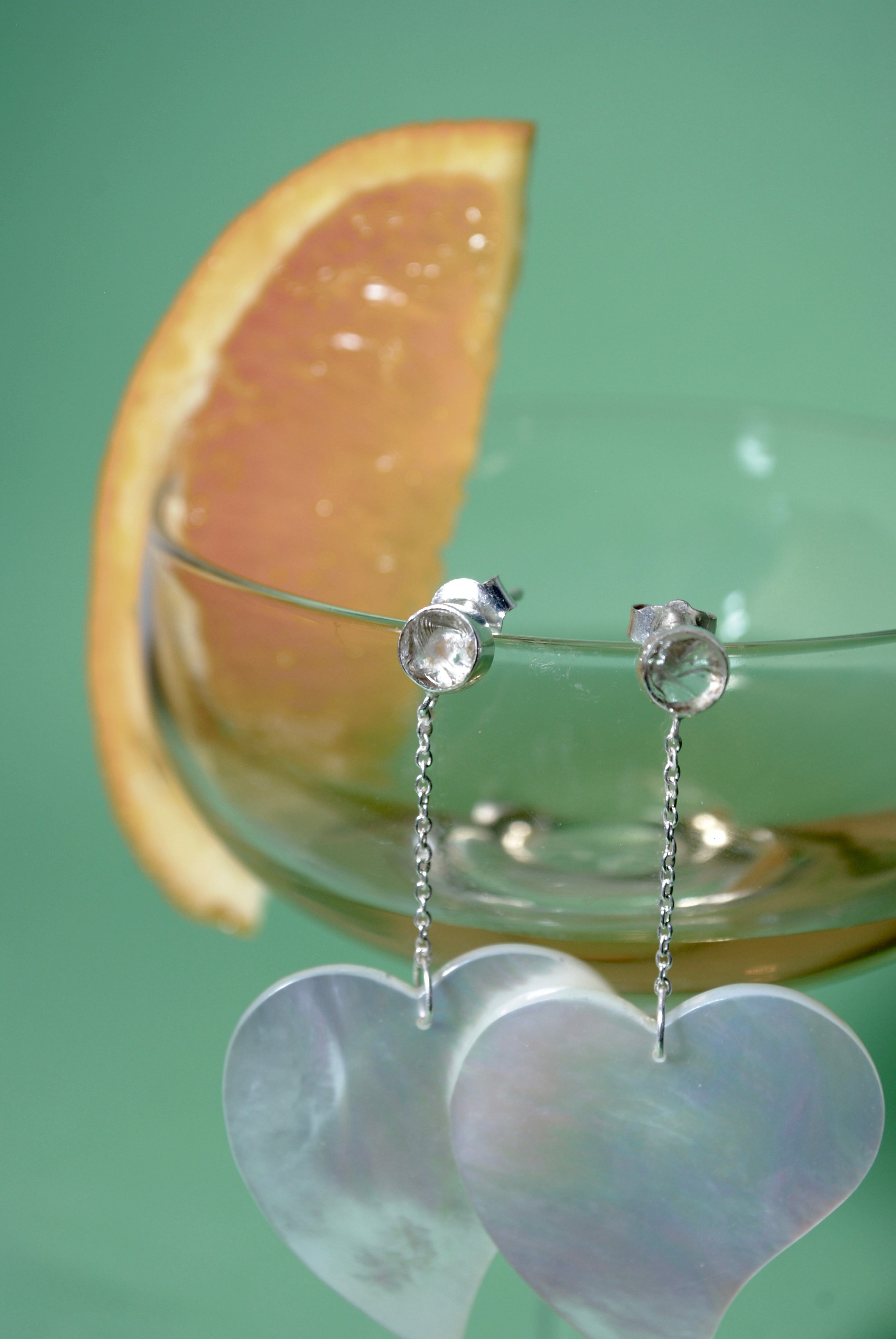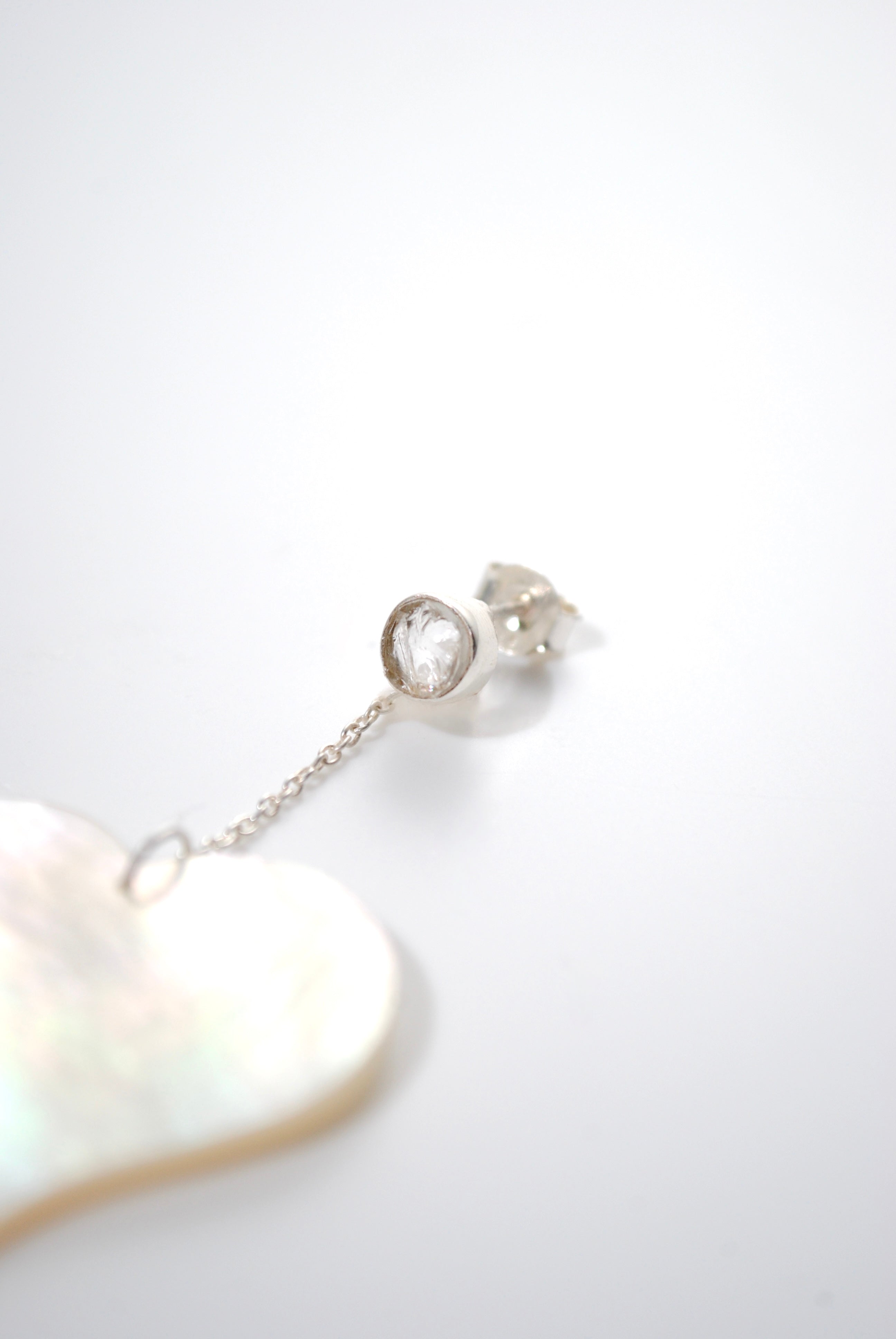 夏らしい変形ハートのシェルに、クリスタルの原石のコンビネーションイヤリング。とても軽量で着け心地が良く、ハートが変形しているで子供っぽくなりすぎないところもポイント。