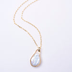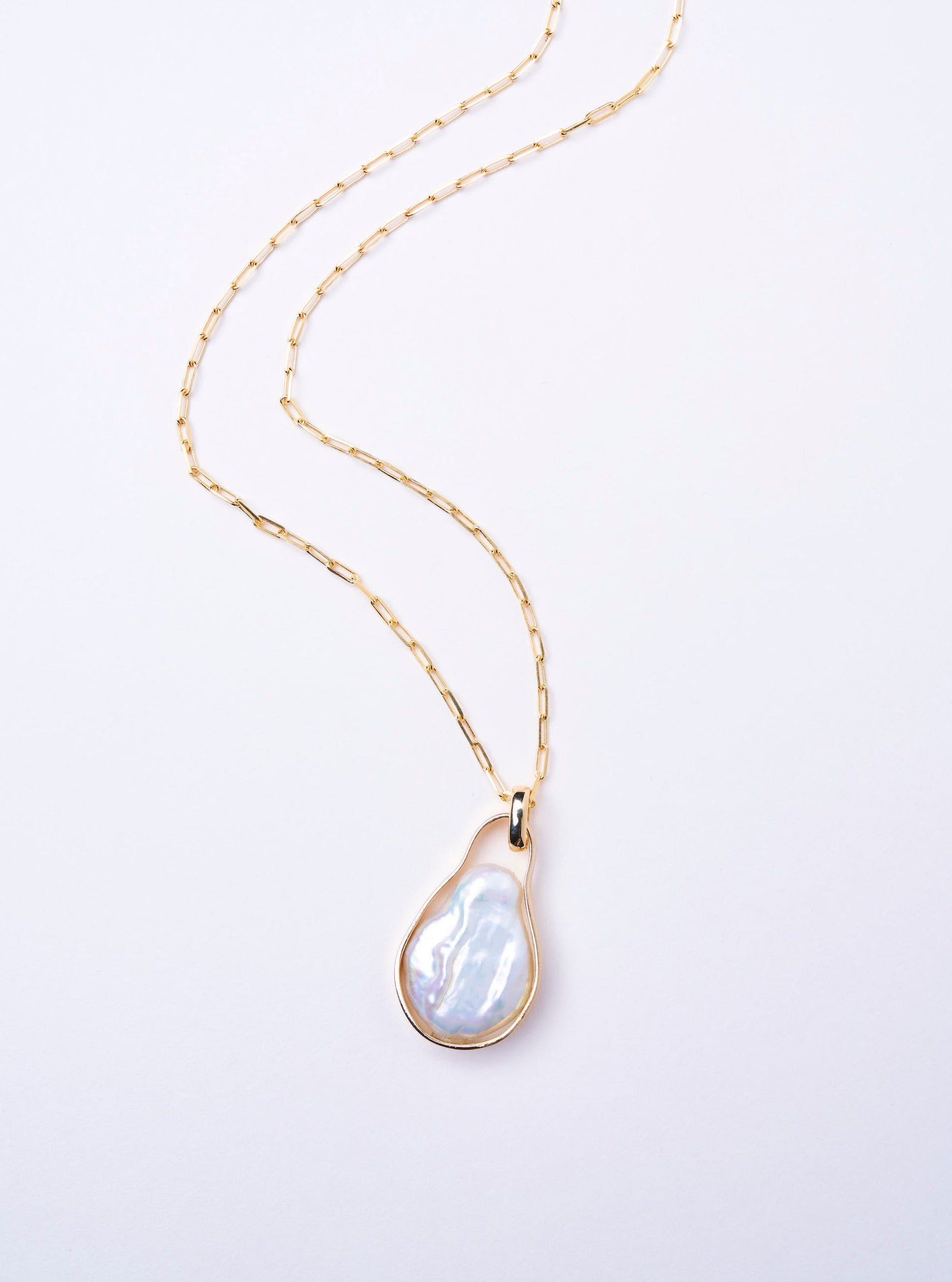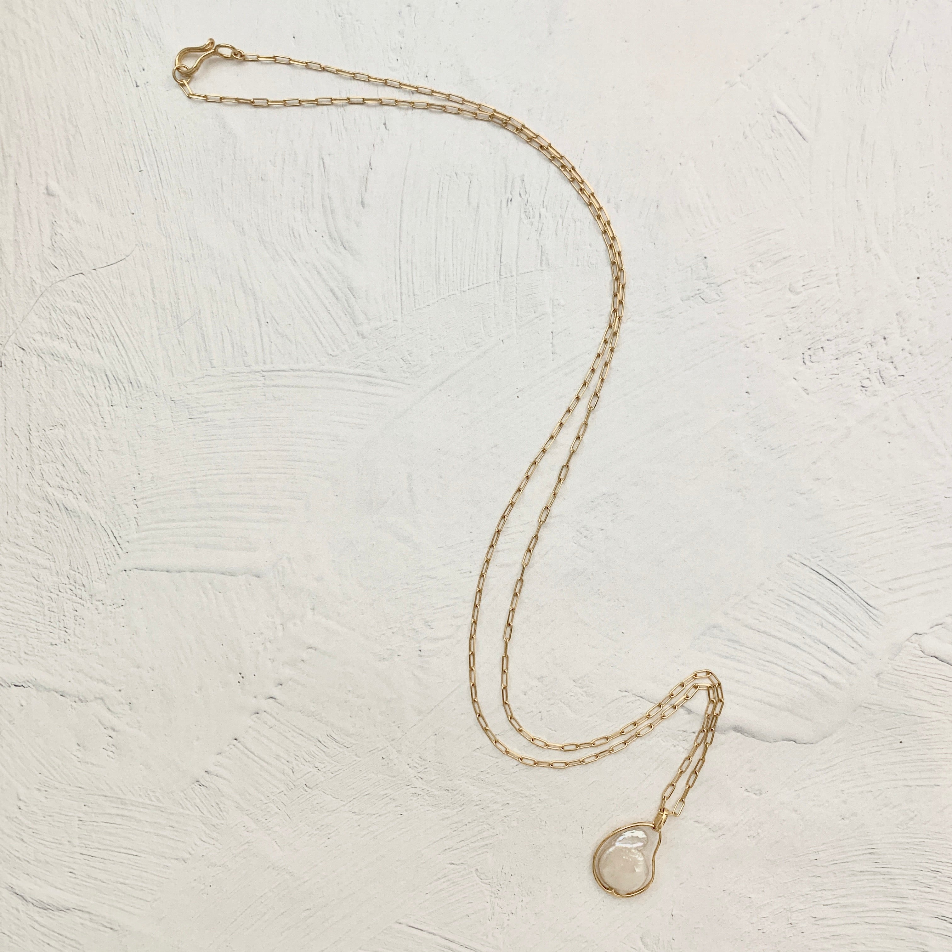 テープ状のシルバーの囲いの中でパールが泳ぐ、空間を楽しんでいただきたいネックレス。自然の形を生かしたフラットな変形パールが個性豊かです。長めのチェーンは、厚手のニットの上からでも。着用時、首が凝らないよう、見た目に反して軽量でお作りしているのも、ストレスフリーにお着けいただけるポイント。