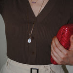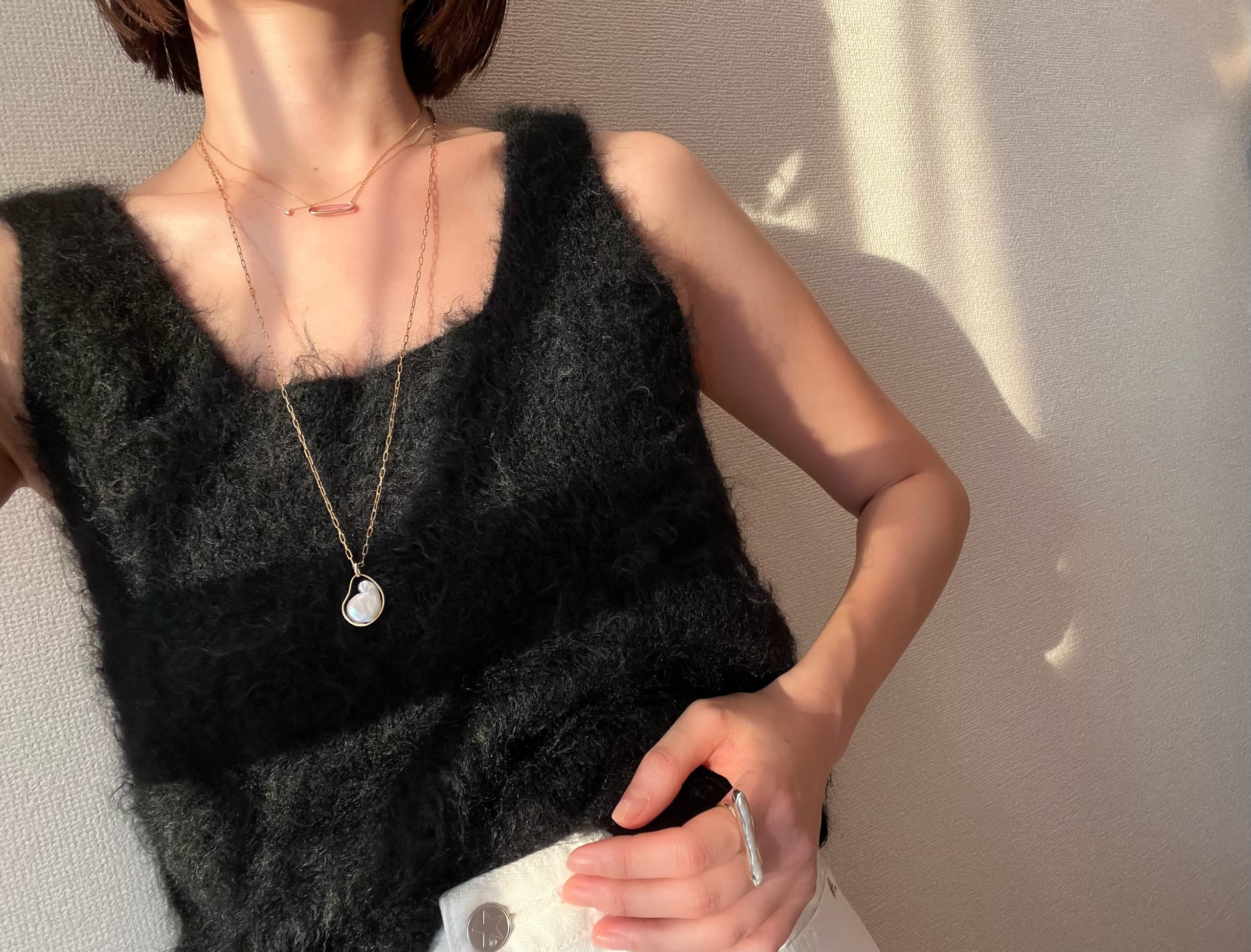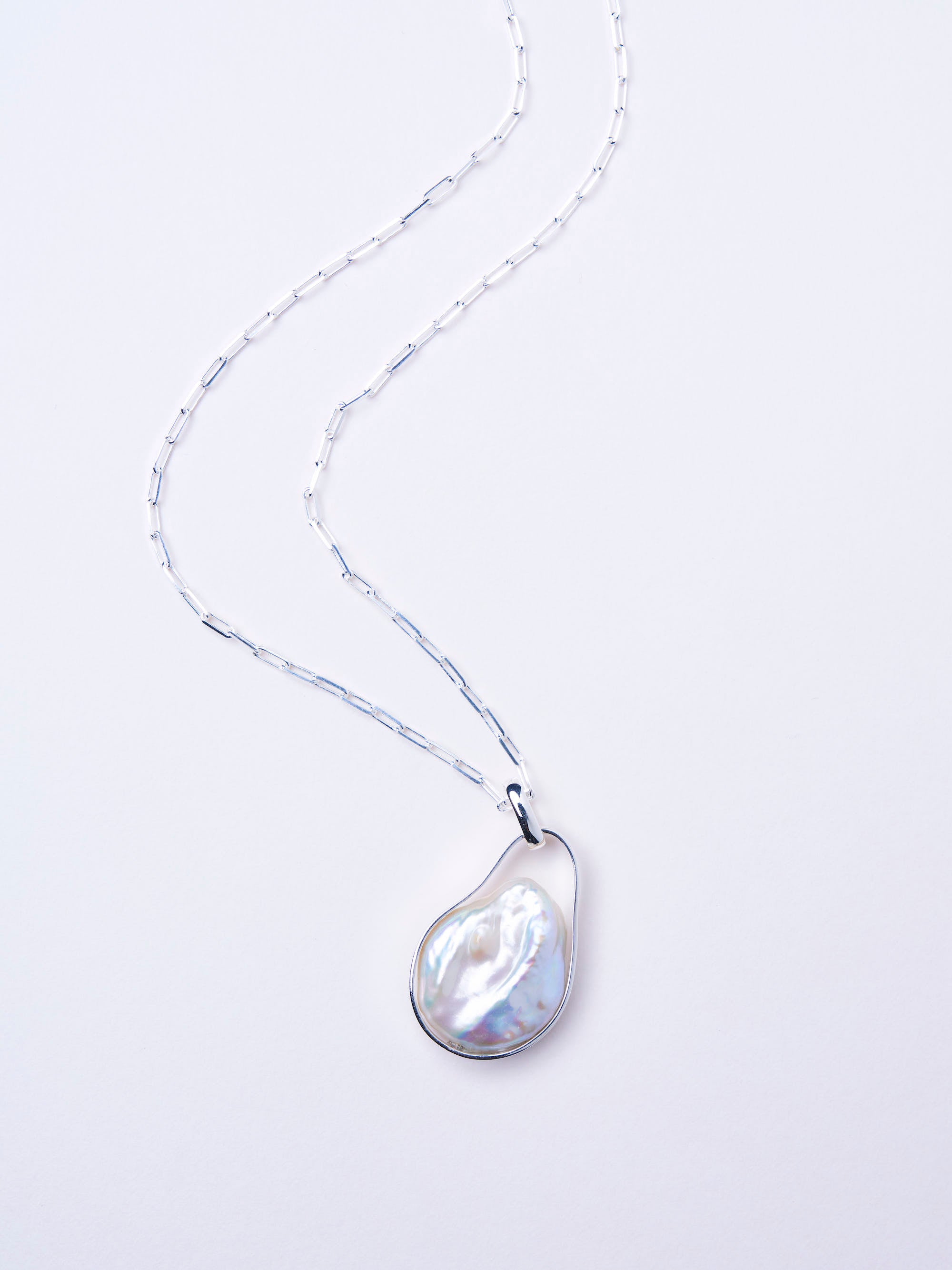 テープ状のシルバーの囲いの中でパールが泳ぐ、空間を楽しんでいただきたいネックレス。自然の形を生かしたフラットな変形パールが個性豊かです。長めのチェーンは、厚手のニットの上からでも。着用時、首が凝らないよう、見た目に反して軽量でお作りしているのも、ストレスフリーにお着けいただけるポイント。