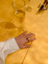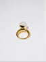 This ring, resembling an upside-down acorn, looks like a lollipop. The contrasting thickness of the arms gives it a voluminous feel.