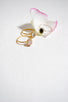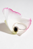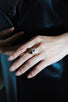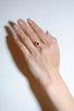 This gorgeous ring features moissanite pavé all around the stone. The back is a round, hemispherical shape, resembling an egg. Though small, the weight of the metal is felt, making it a luxurious piece. When viewed from the side, the stone is set to appear as if it is standing up, creating a beautiful silhouette.