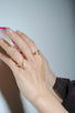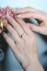 This gorgeous ring features moissanite pavé all around the stone. The back is a round, hemispherical shape, resembling an egg. Though small, the weight of the metal is felt, making it a luxurious piece. When viewed from the side, the stone is set to appear as if it is standing up, creating a beautiful silhouette.