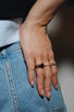 This piece is set with a unique, irregularly shaped stone, cut into an asymmetrical hexagon. The sophisticated form, created by the interweaving of straight lines and angles, gives a modern and elegant impression to your fingers.
