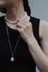 This necklace allows you to enjoy the space of pearls floating within a tape-like silver enclosure. The flat, irregular pearls, taking advantage of their natural shape, are unique. The long chain can be worn over a thick knit. Contrary to its appearance, it is lightweight, preventing neck stiffness, making it a stress-free piece to wear.