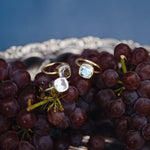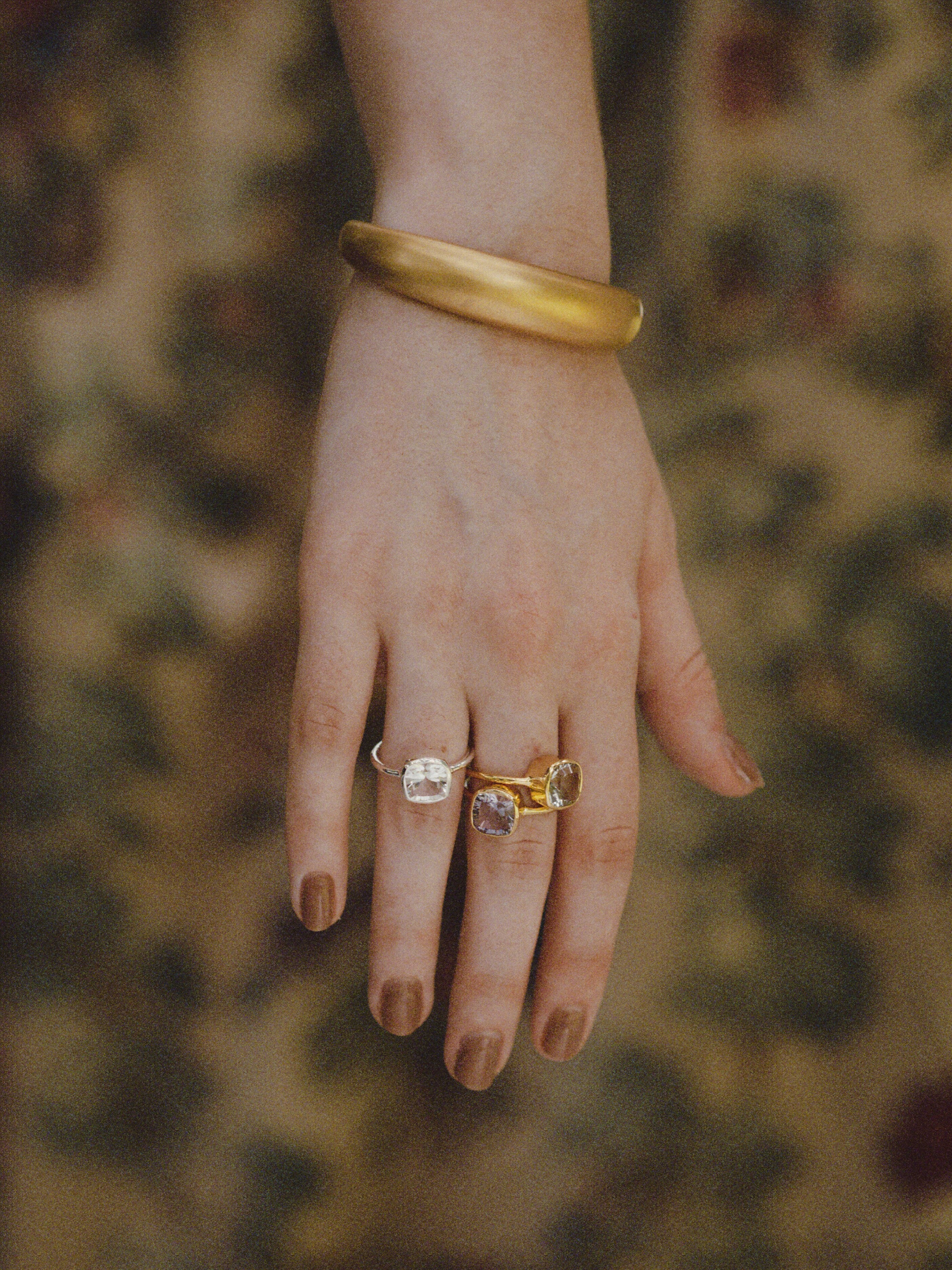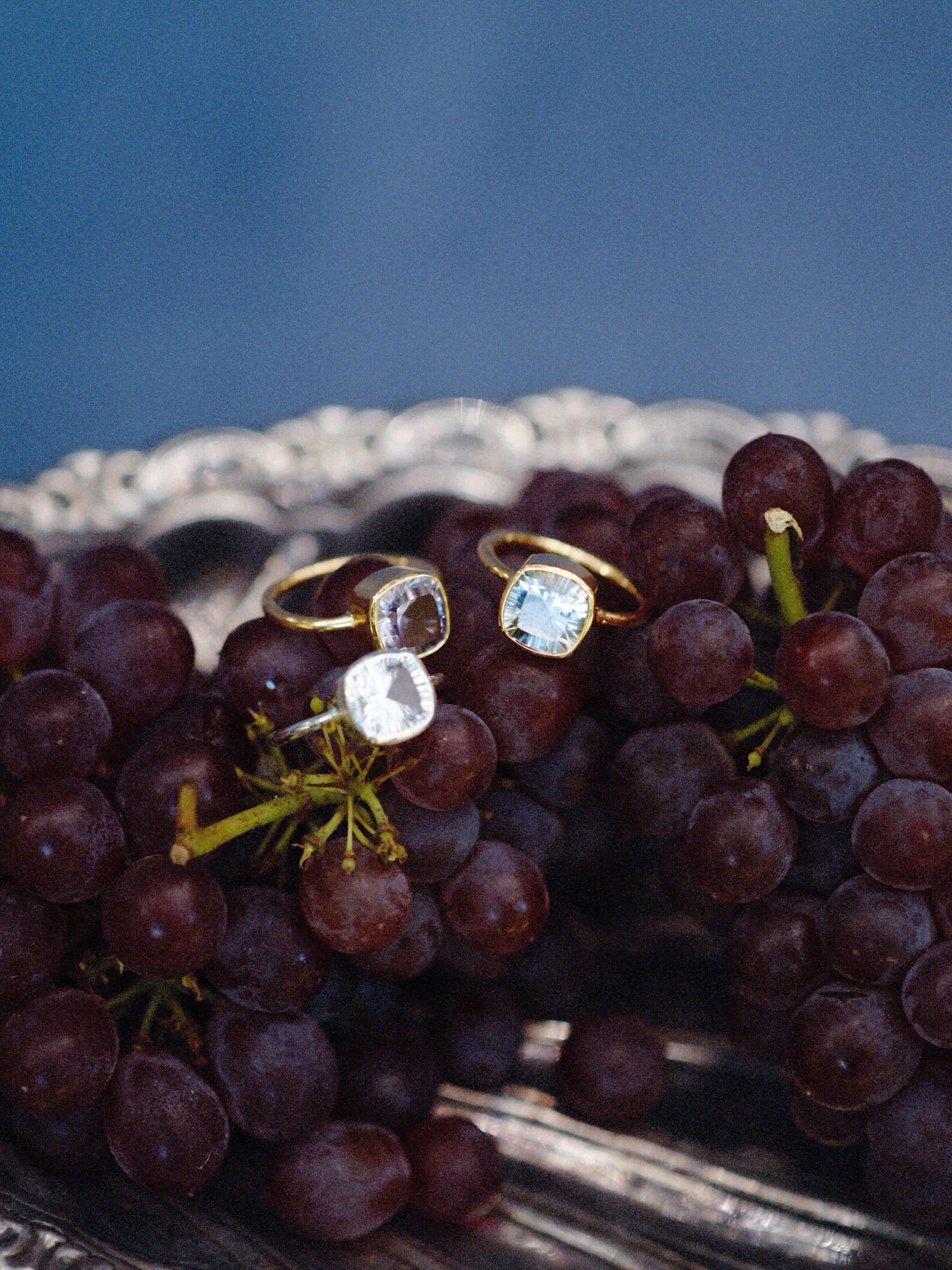 放射線状に筋が入るような輝きが作れる"コーンケイブカット"を用いたストーンを使用。高度な技術が必要で、従来のノーマルなカットより石を削る工数が多いそのため、時間と手間を惜しまず作られたスペシャルなジュエリー。石を引き立たせるために、余計な装飾を削ぎ落としつつも、柔らかなフォルムで上品さをプラスしました。