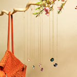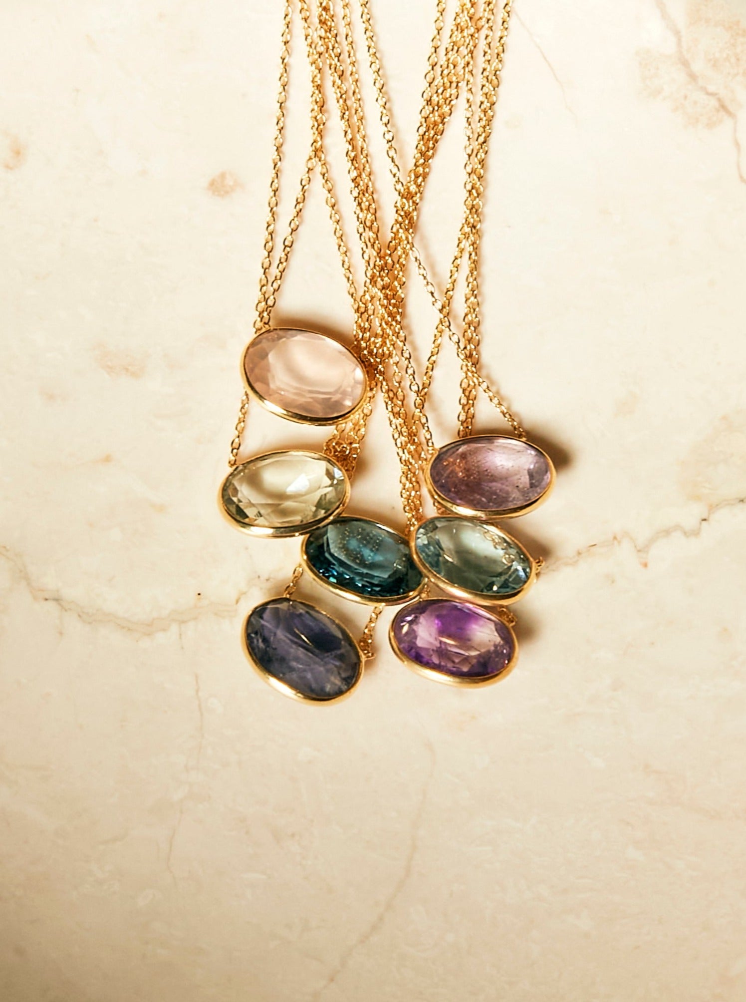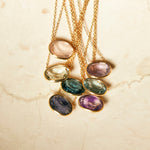 シンプルなデザインで石の存在が引き立ちます。華奢なチェーンなので重ね付けしても上品にまとまります。石の裏面に細かく面を取ることでキラキラと石を輝かせるカッティングを用いておりとても華やかな印象です。