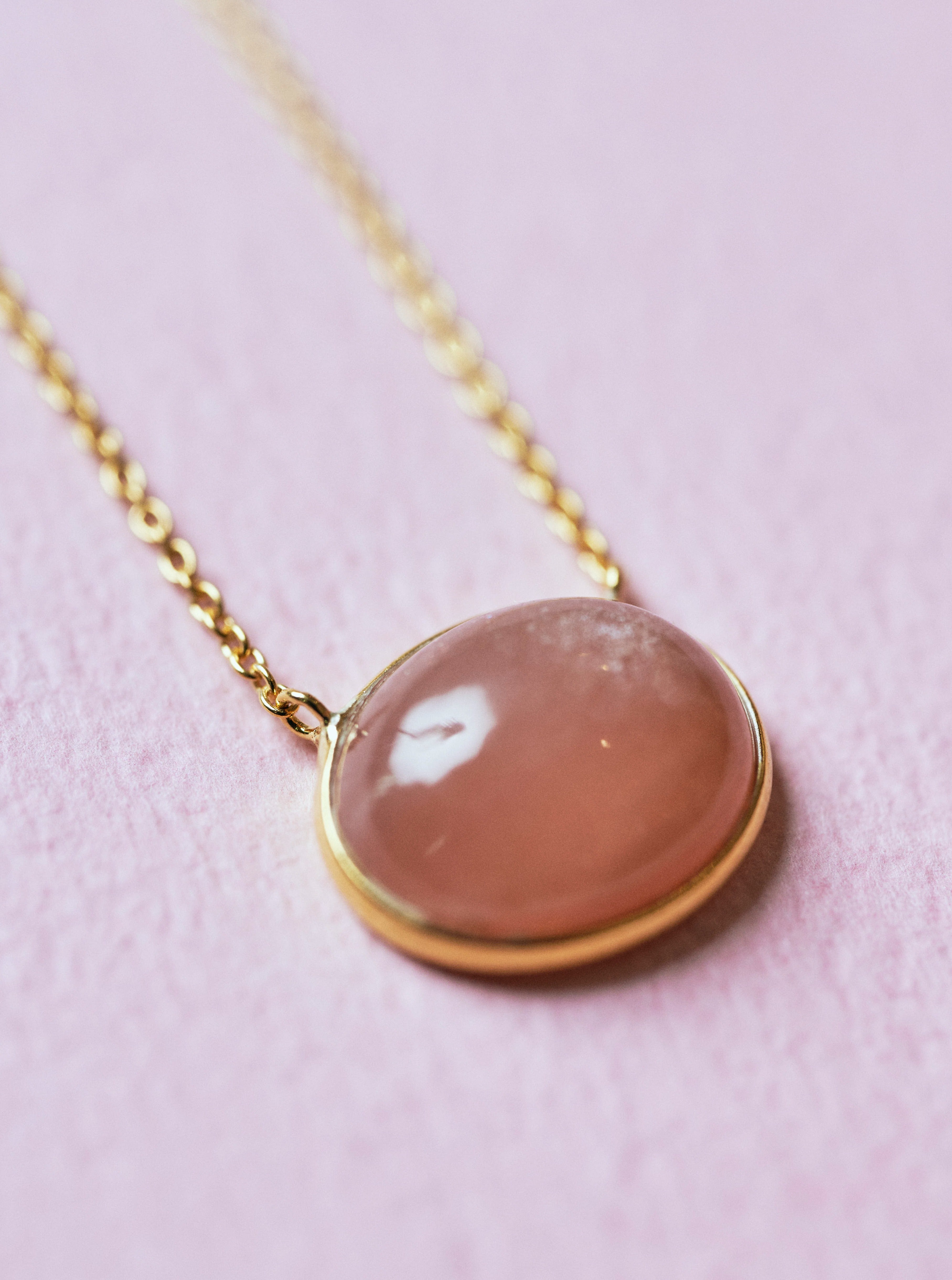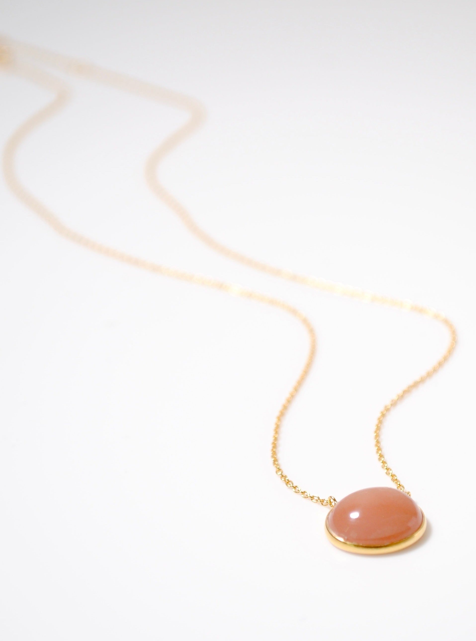 シンプルなデザインで石の存在が引き立ちます。華奢なチェーンなので重ね付けしても上品にまとまります。つるんとしたカボションカットを用いており、うるうるとした果実のような瑞々しさを胸元に。