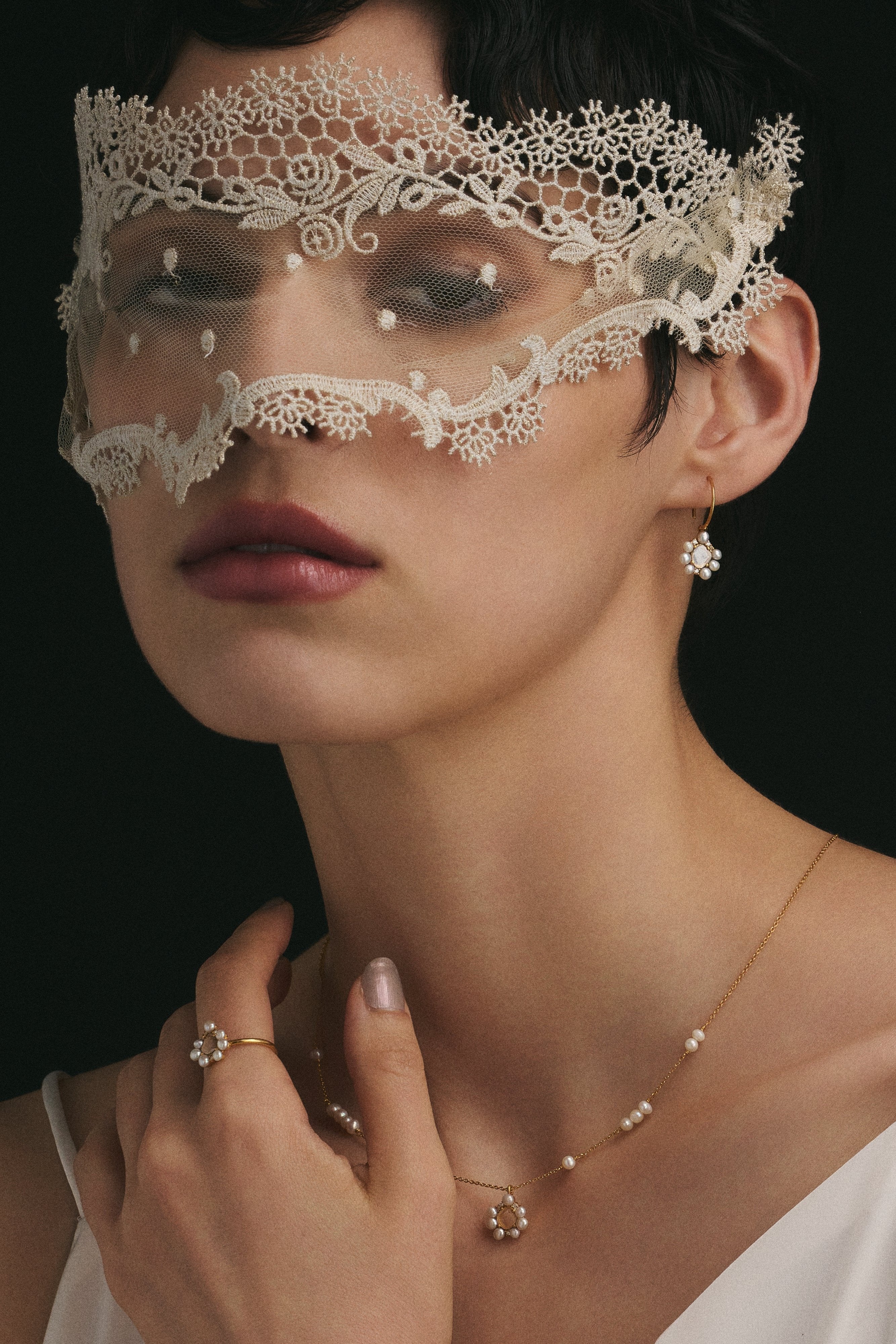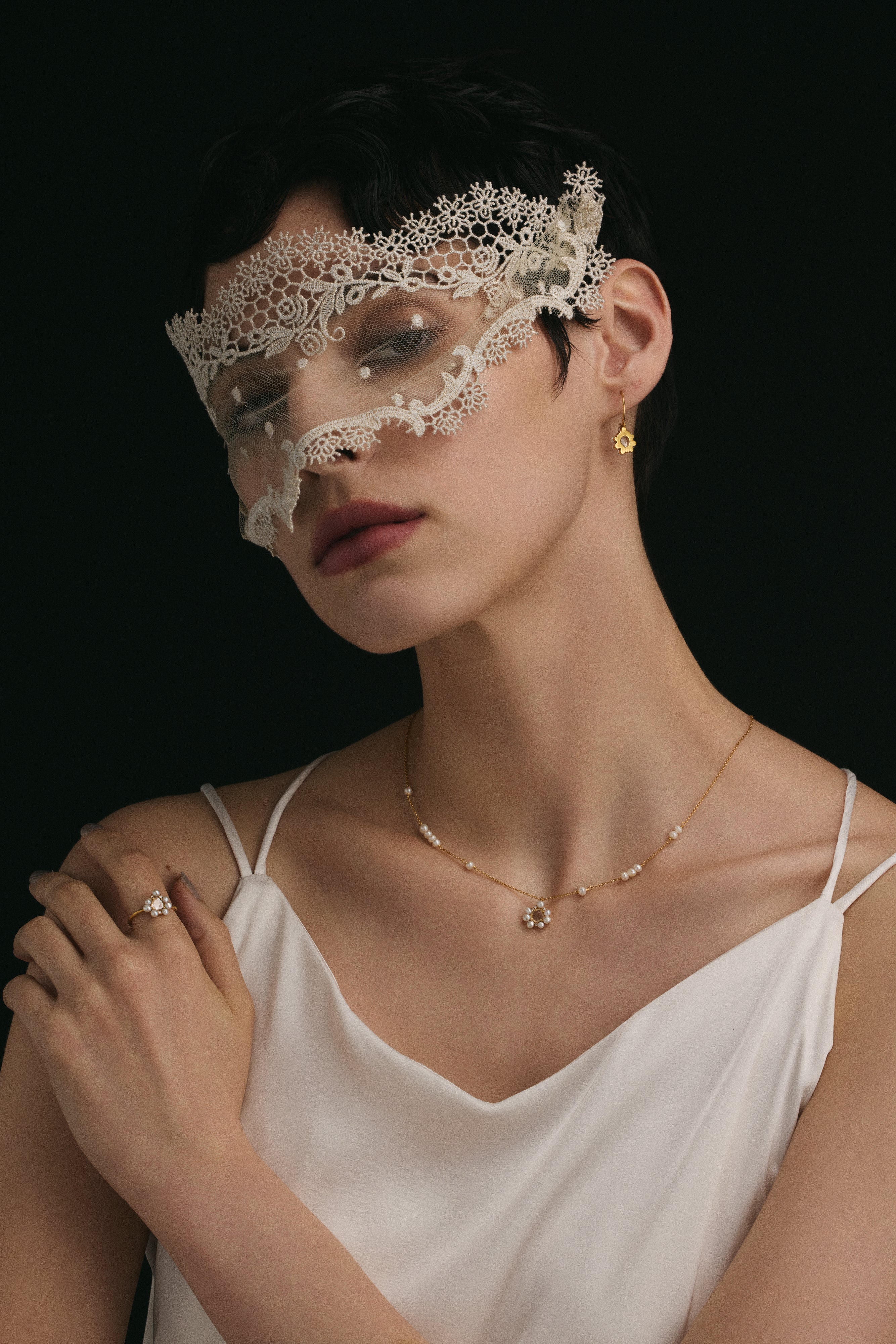 雪の結晶をイメージしたジュエリー。センターにはインドの最も古く伝統あるダイヤモンドのカッティング技術であるポルキ(繊細に薄くカットされたスライスダイヤモンド)を配置。周りには大きさにアクセントをつけ、ランダムなリズム感が楽しいパールやモアサナイトを。ピュアな印象の中にも、高級感を秘めたジュエリーへと仕上げています。