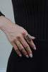 縦長のオーバルフォルムが指先に優美な存在感を添える リング。