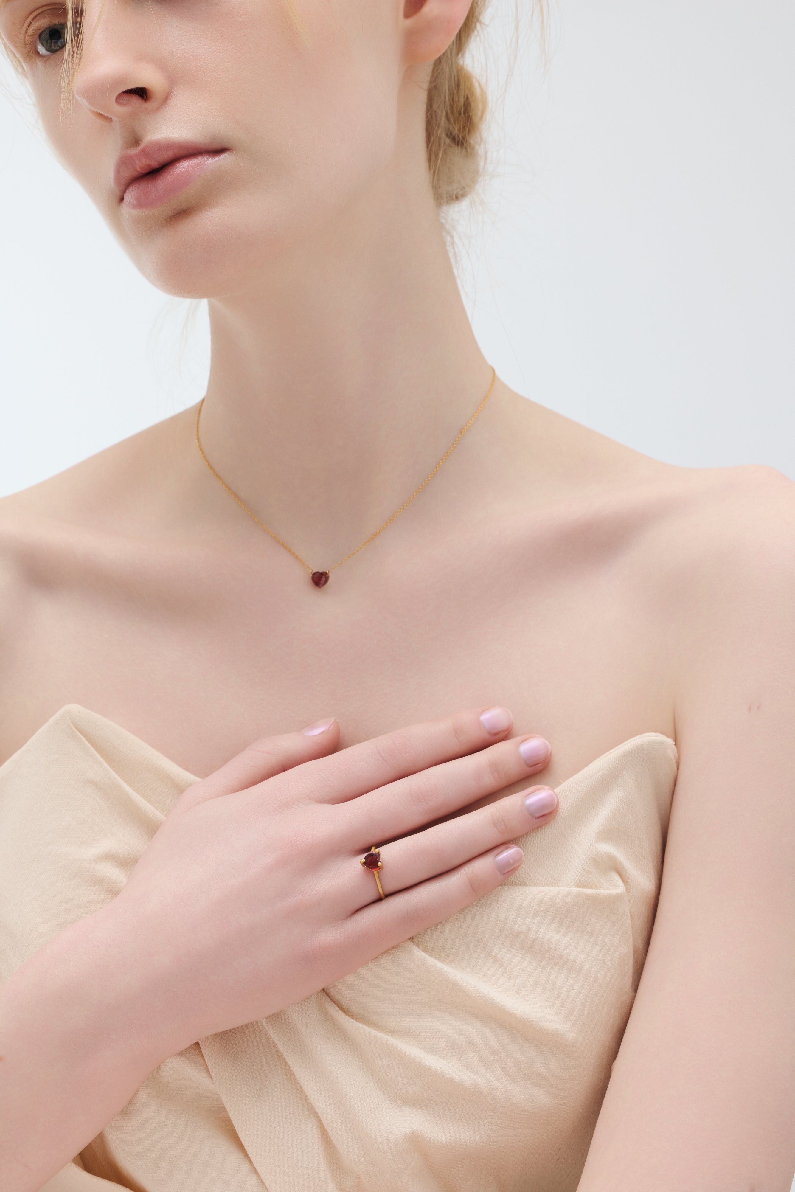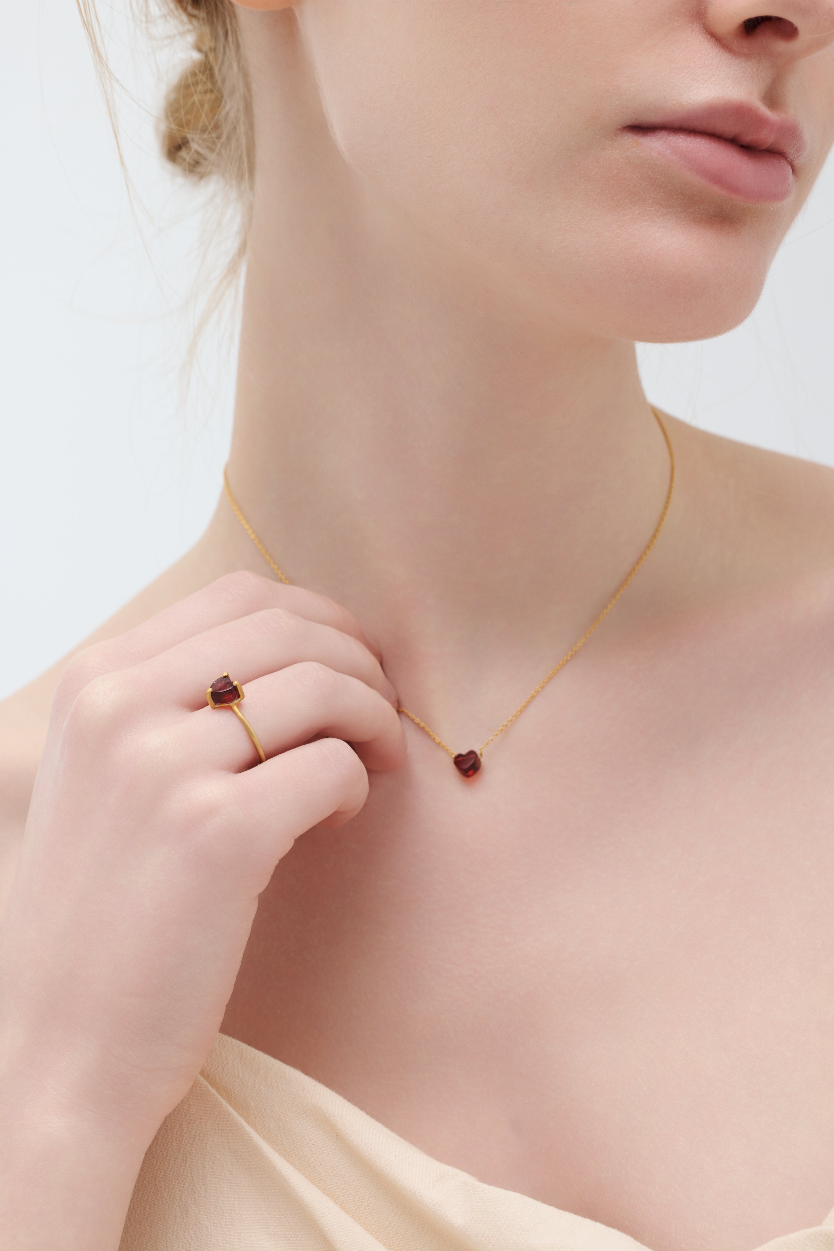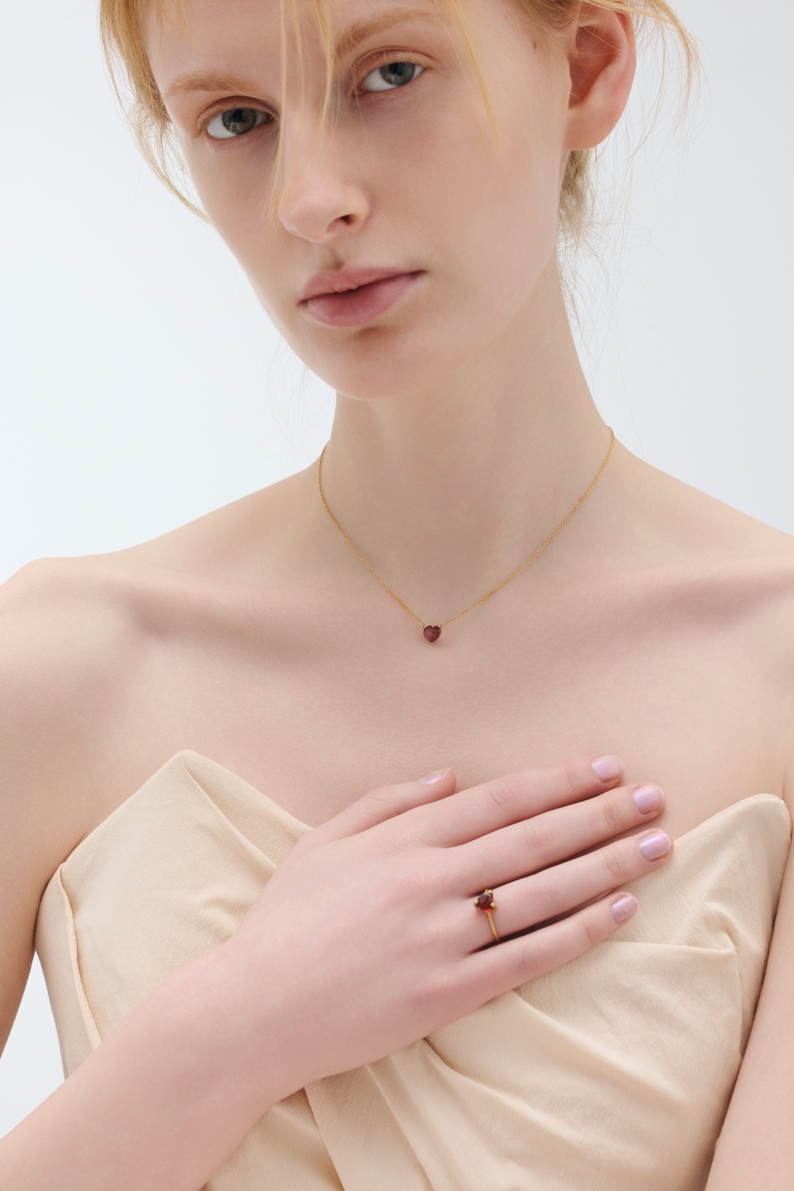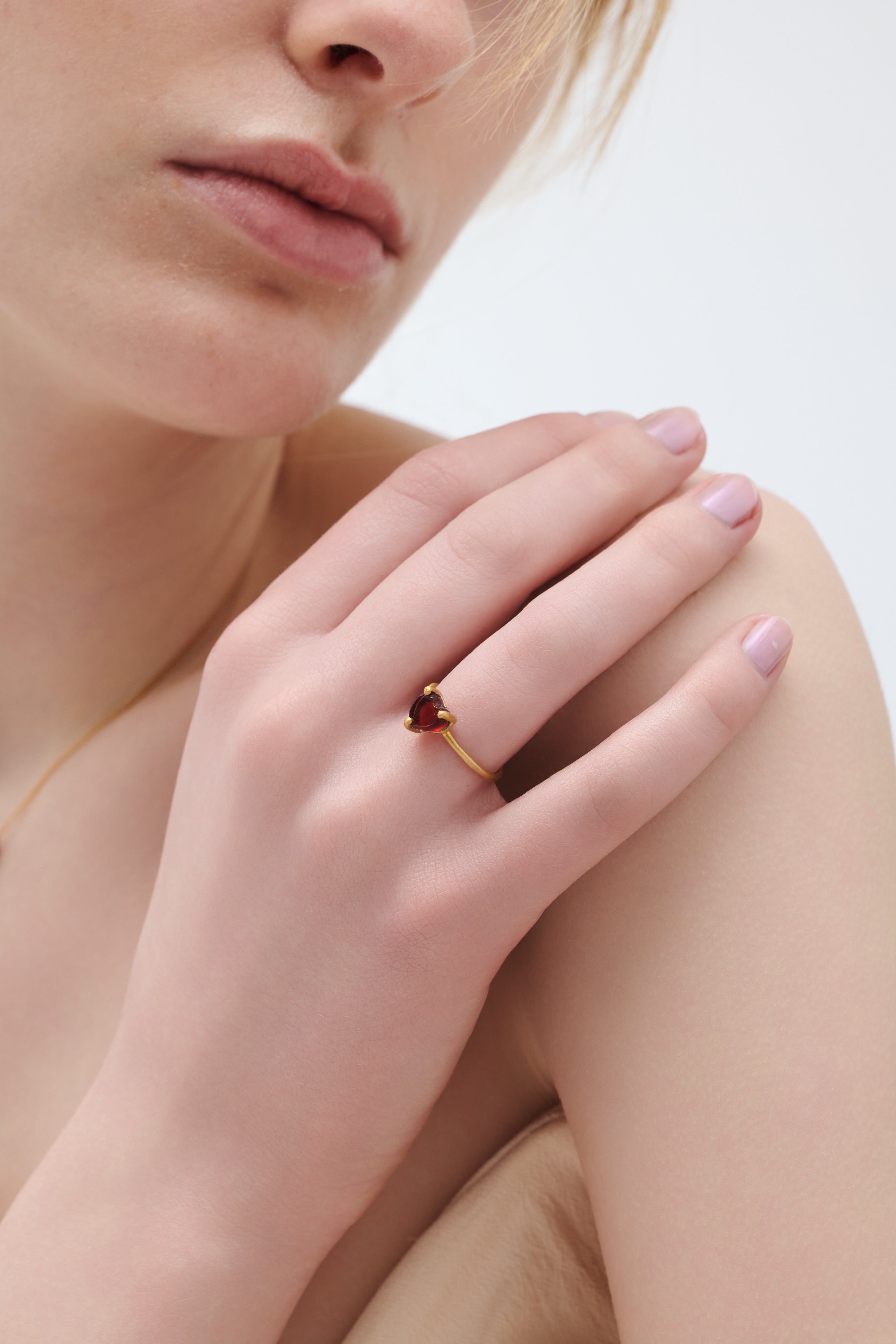 大人の遊び心を宿しながら、可憐で肌に自然と溶け込む「petit heart」コレクション。石を留める爪や枠を最小限に抑え、全方向から光を取り込む設計にすることで、天然石でかたどったハートモチーフの本来の色味や透明感をより美しく引き立てました。装飾を削ぎ落としたミニマルなデザインが、石そのものの存在感を静かに際立たせます。