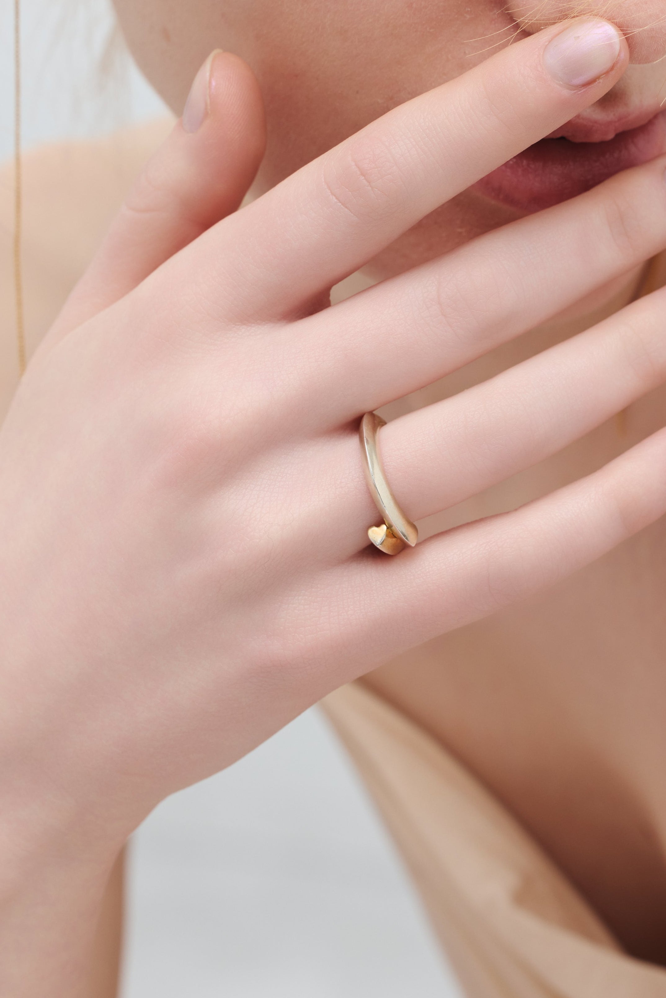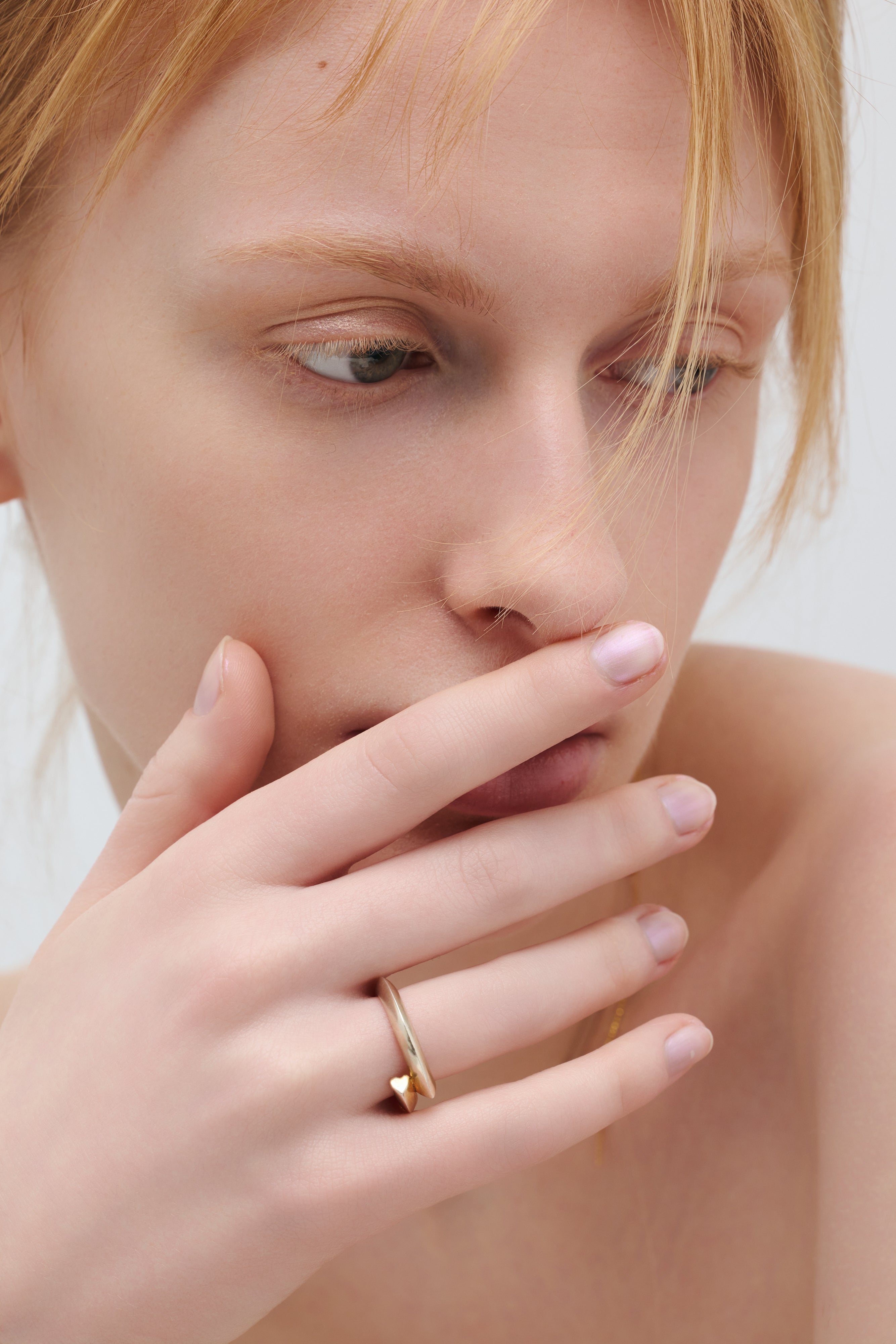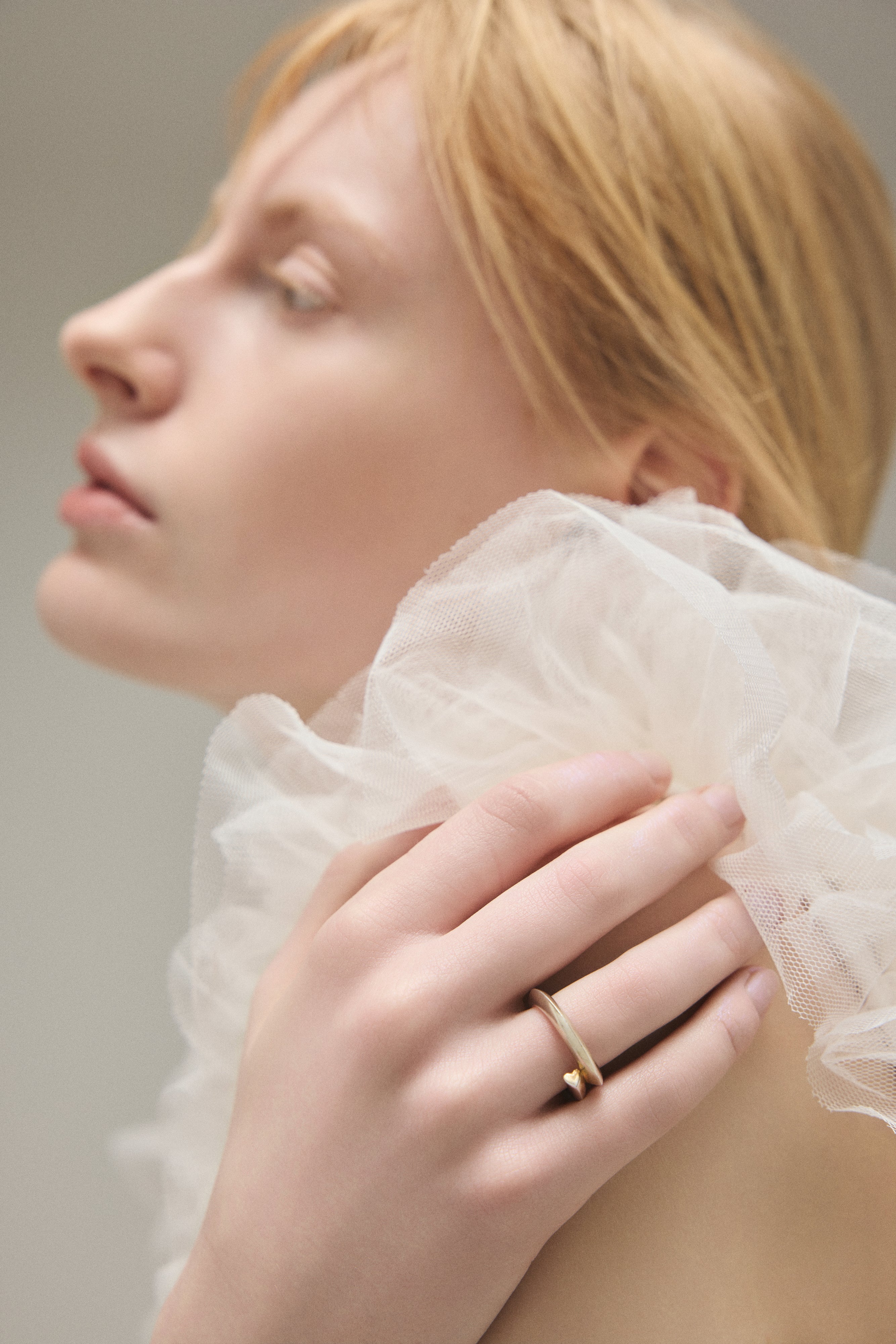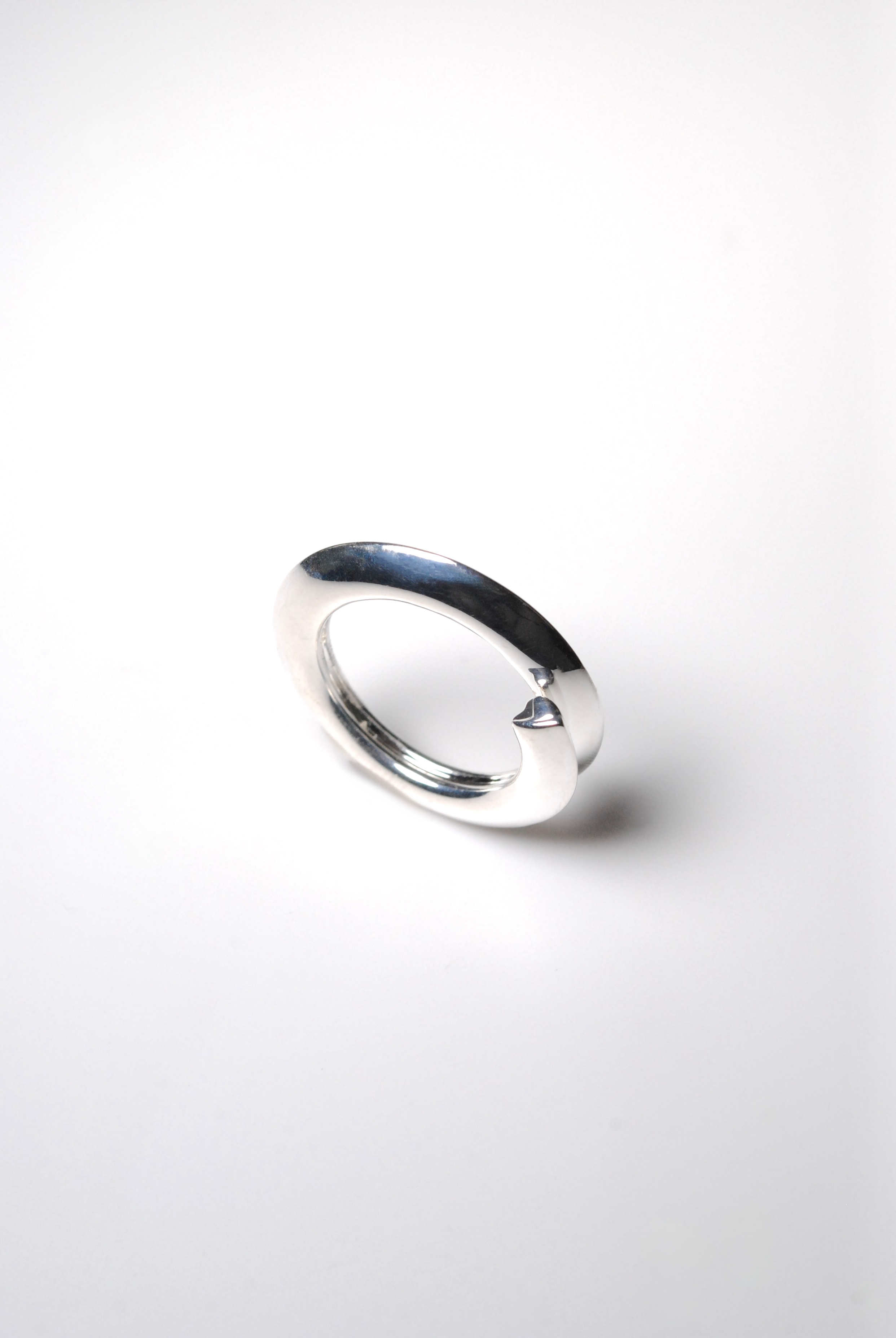 断面に潜ませたハートの切り口が大人の遊び心をくすぐるリング。シルバーを贅沢に使用し、程よいボリューム感と指先に伝わる心地よい重みが、まさに「身に纏うオブジェ」として感じられるジュエリー。