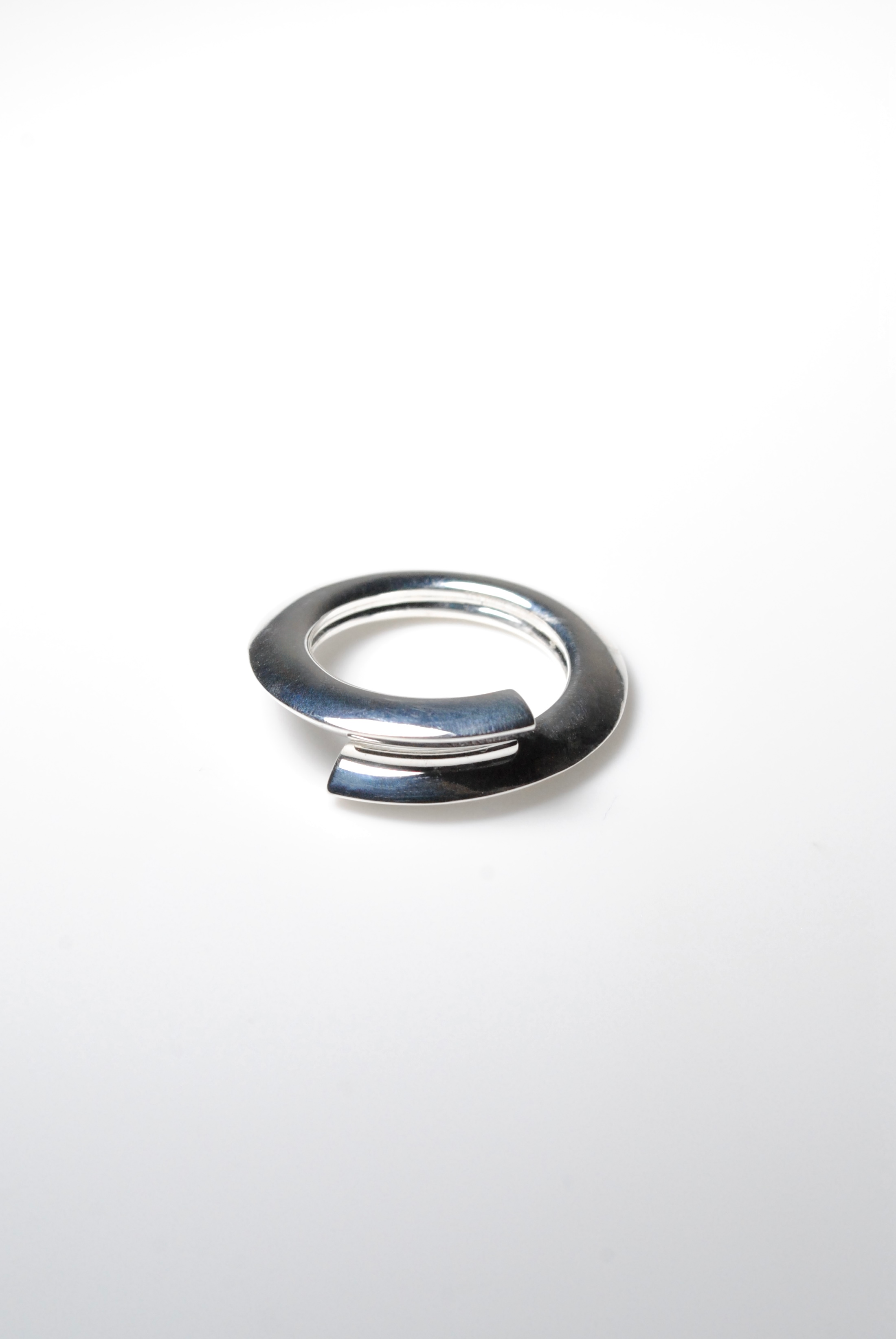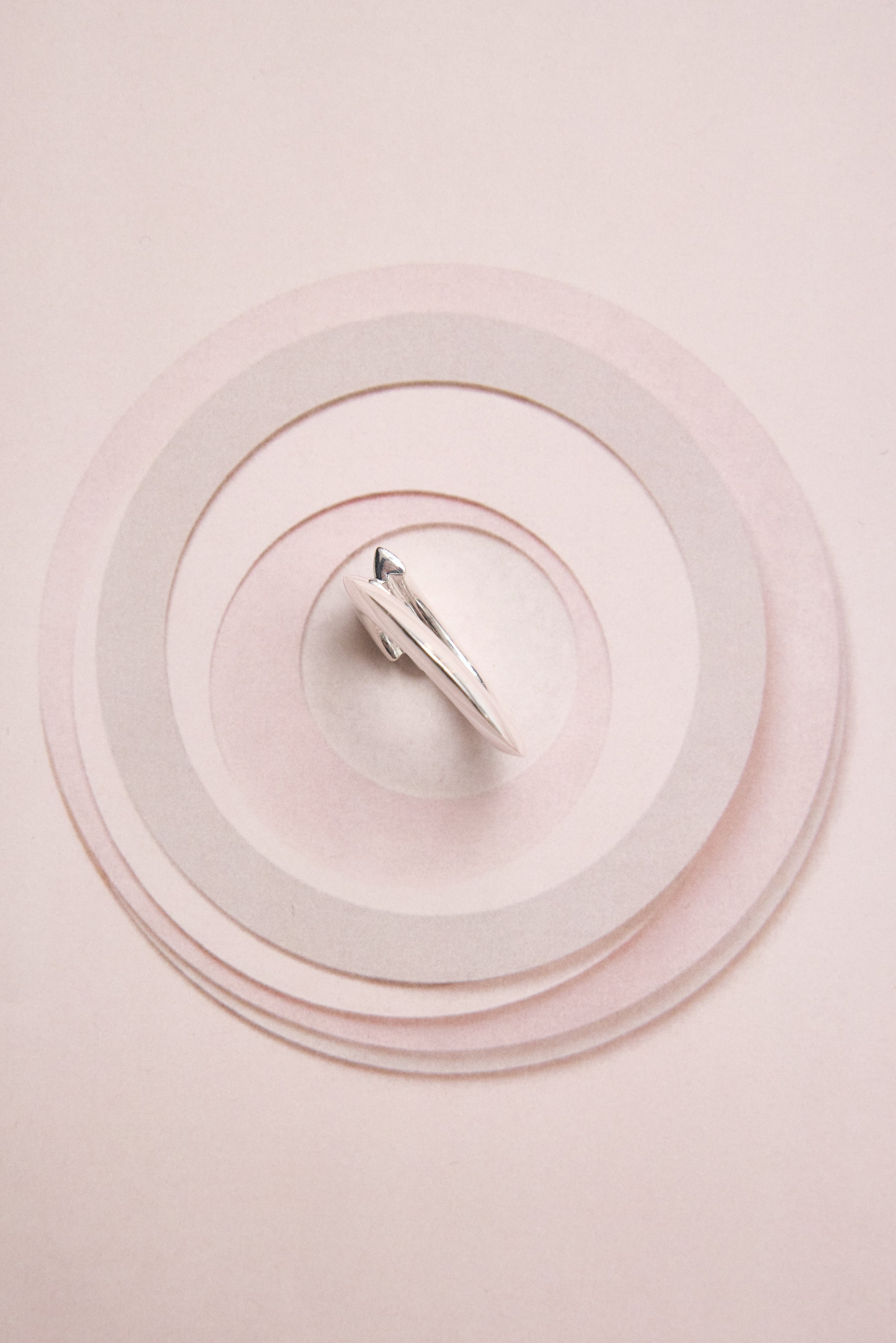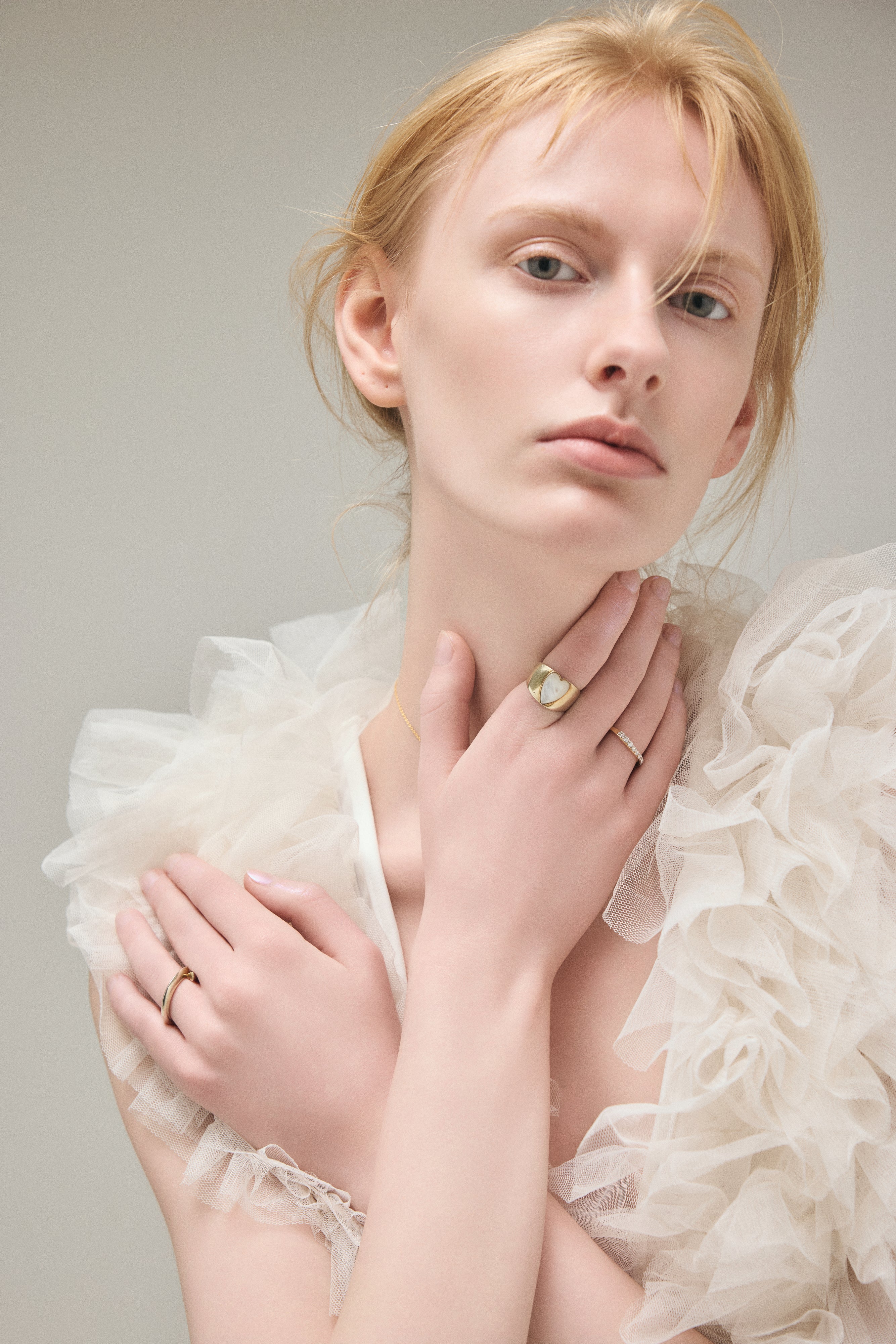 断面に潜ませたハートの切り口が大人の遊び心をくすぐるリング。シルバーを贅沢に使用し、程よいボリューム感と指先に伝わる心地よい重みが、まさに「身に纏うオブジェ」として感じられるジュエリー。