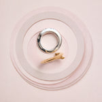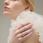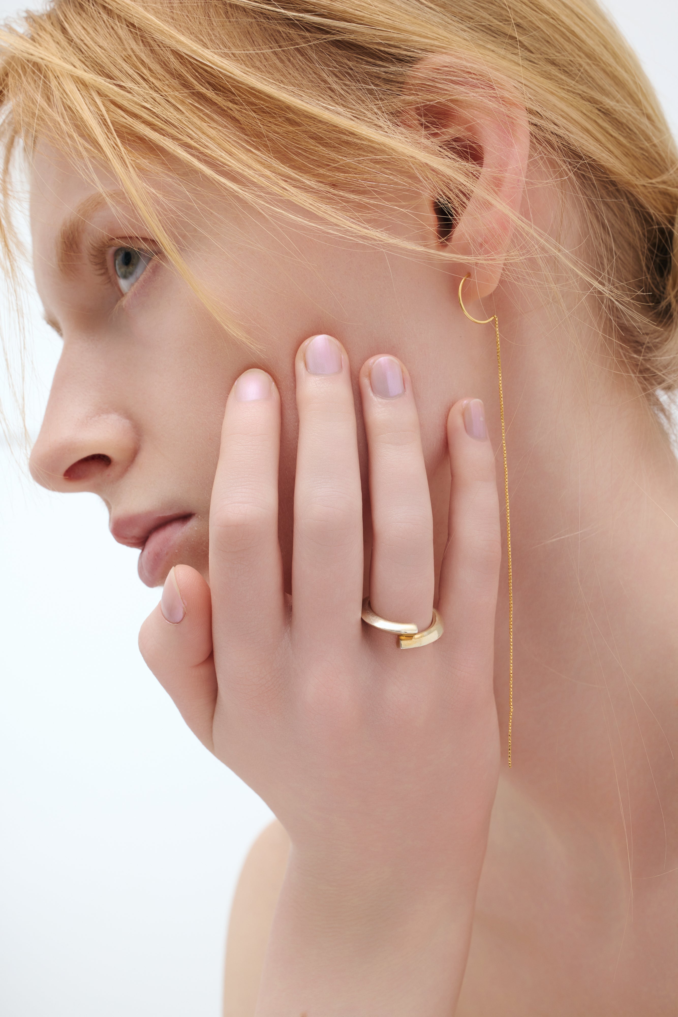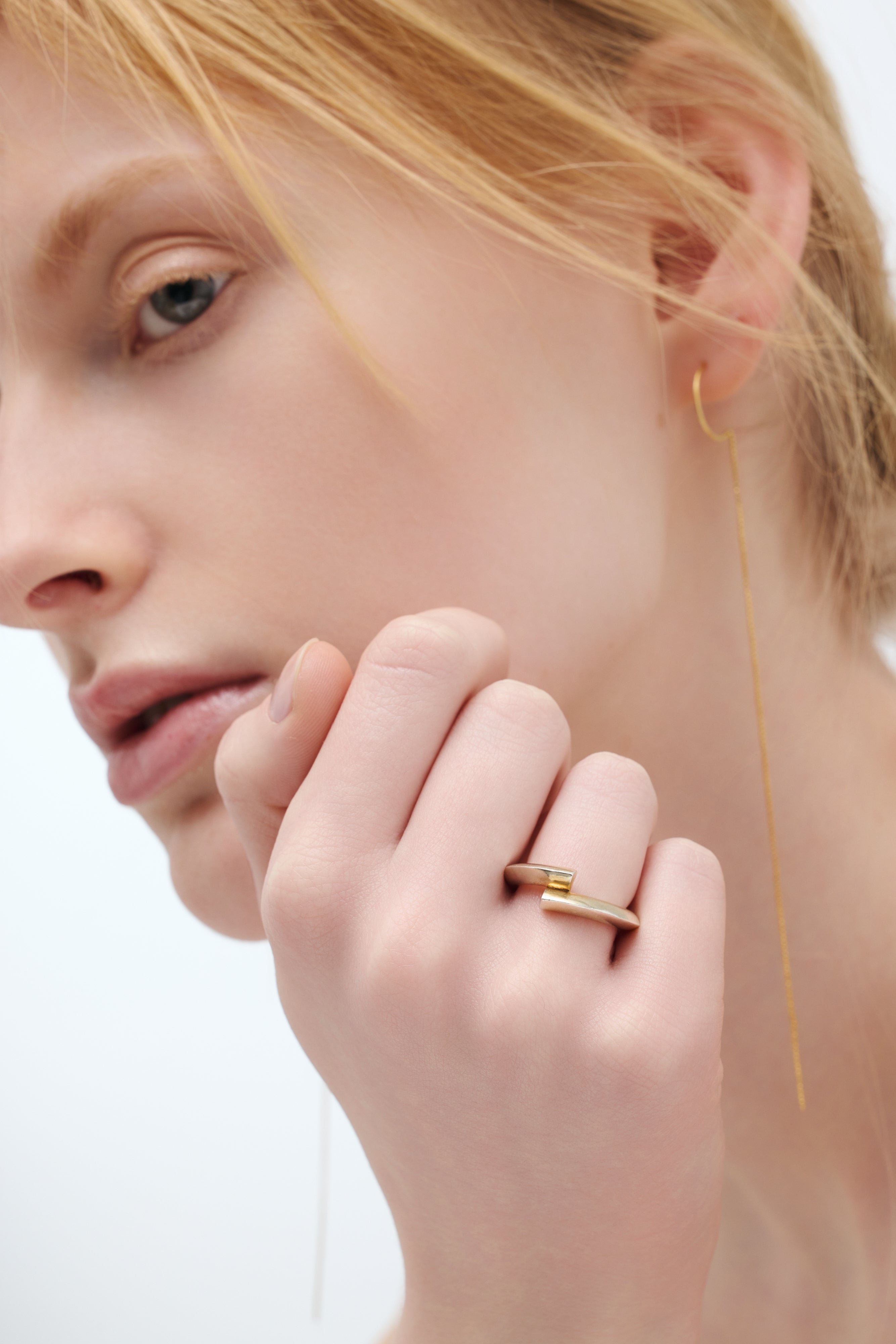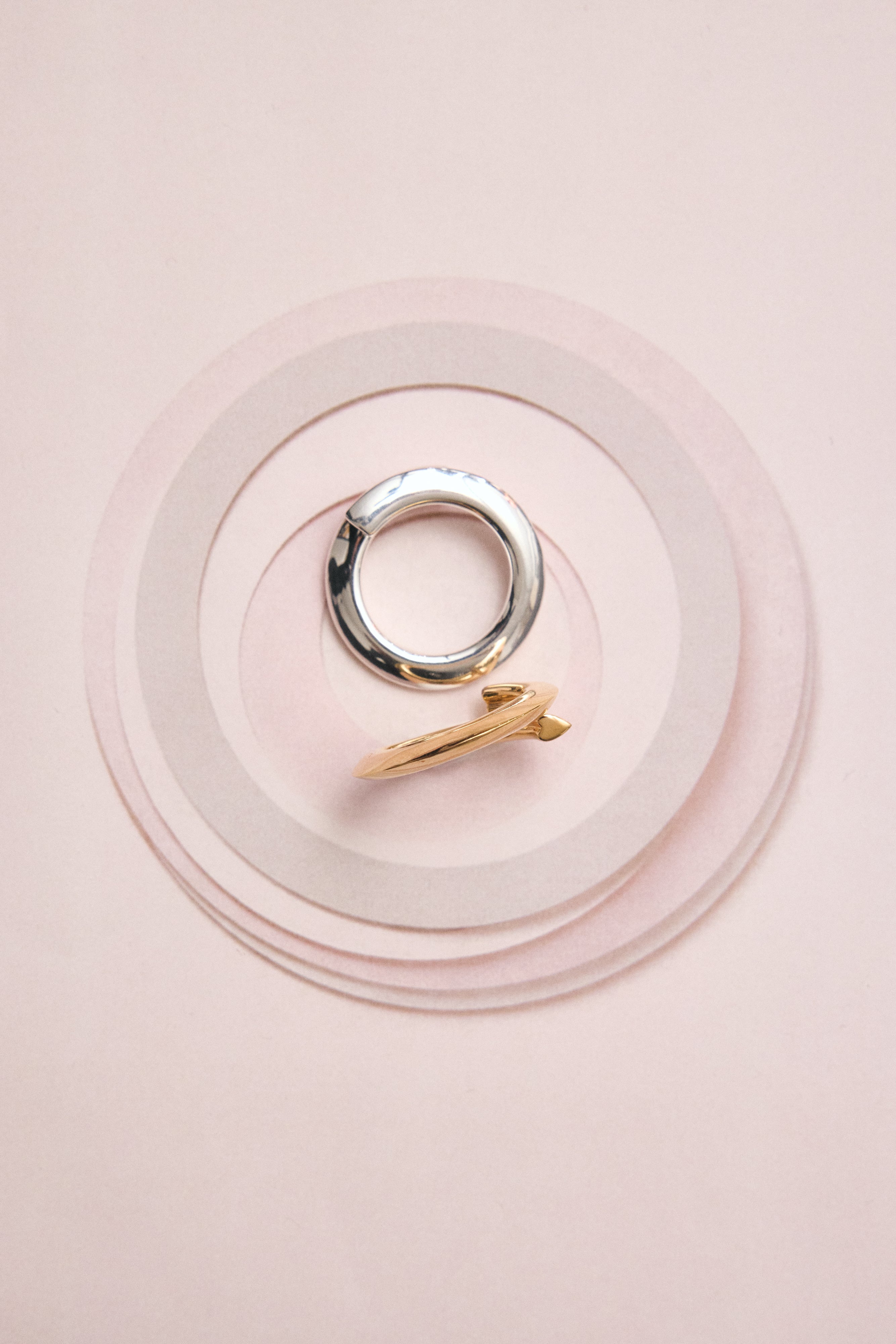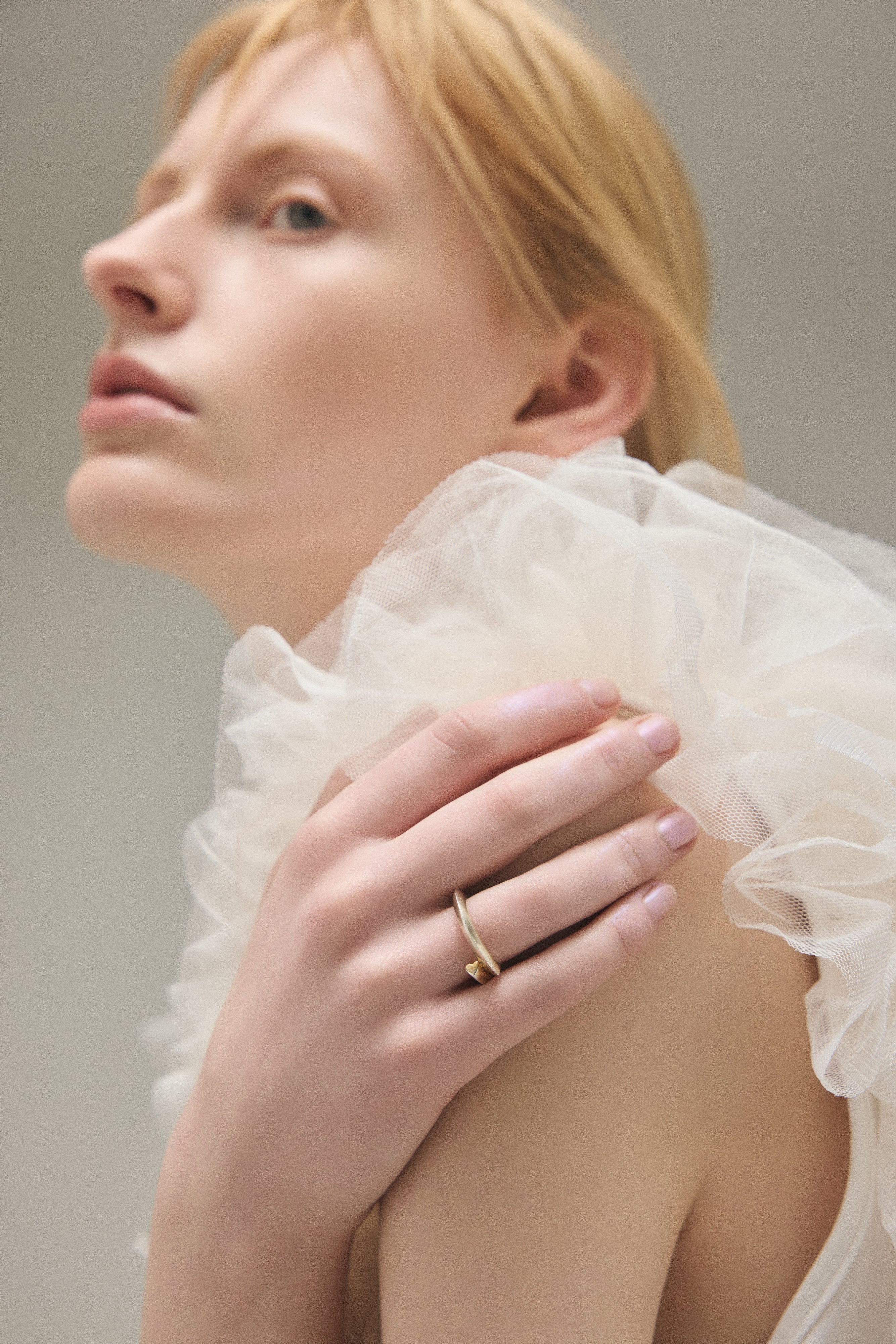 断面に潜ませたハートの切り口が大人の遊び心をくすぐるリング。シルバーを贅沢に使用し、程よいボリューム感と指先に伝わる心地よい重みが、まさに「身に纏うオブジェ」として感じられるジュエリー。